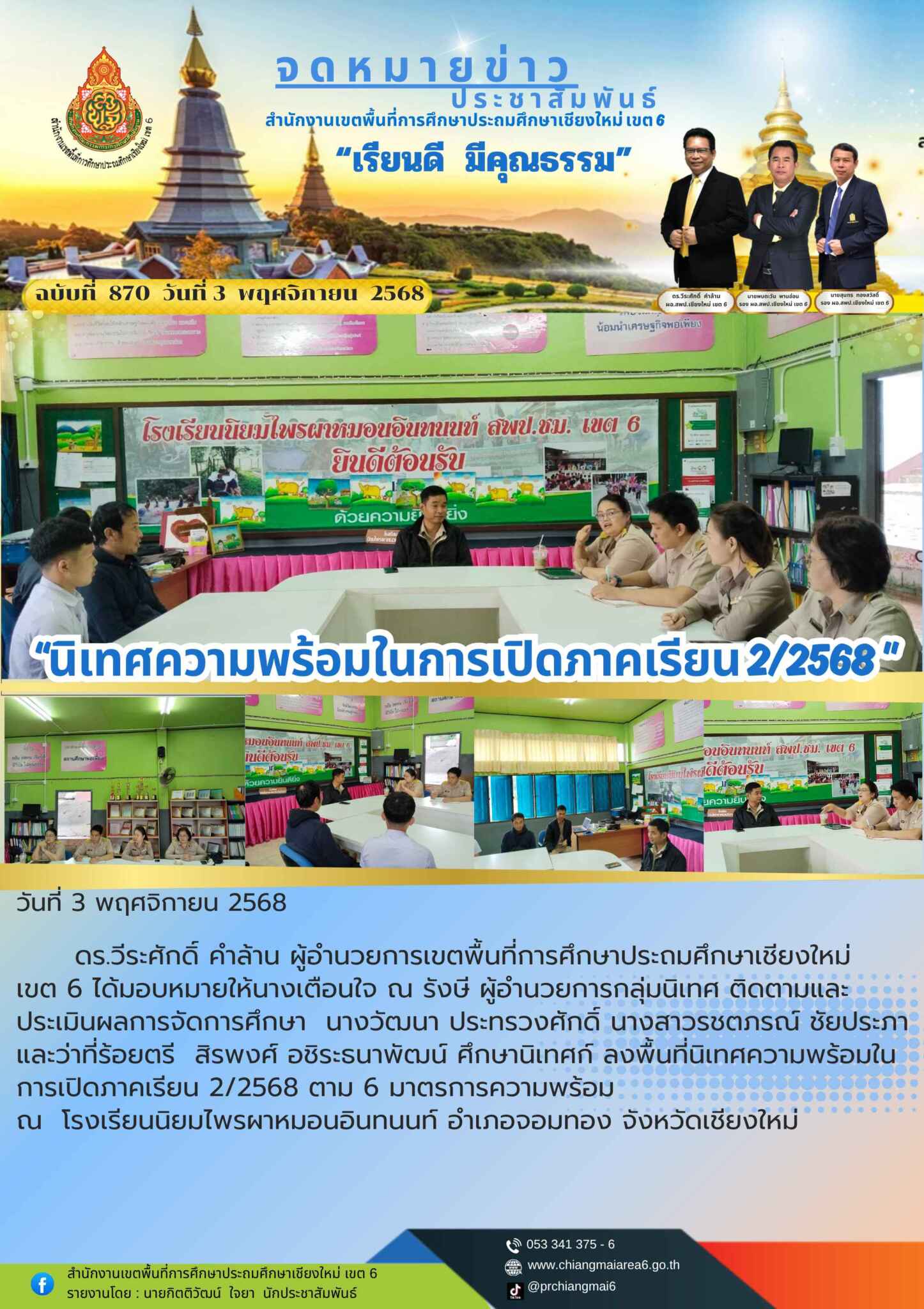 วันที่ 3 พฤศจิกายน 2568 ดร.วีระศักดิ์ คำล้าน ผู้อำนวยการเขตพื้นที่การศึกษาประถมศึกษาเชียงใหม่ เขต 6 ได้มอบหมายให้นางเตือนใจ ณ รังษี ผู้อำนวยการกลุ่มนิเทศ ติดตามและประเมินผลการจัดการศึกษา นางวัฒนา ประทรวงศักดิ์ นางสาวรชตภรณ์ ชัยประภา และว่าที่ร้อยตรีสิรพงศ์ อชิระธนาพัฒน์ ศึกษานิเทศก์ ลงพื้นที่นิเทศความพร้อมในการเปิดภาคเรียน 2/2568 ตาม 6 มาตรการความพร้อม ณ โรงเรียนนิยมไพรผาหมอนอินทนนท์ อำเภอจอมทอง จังหวัดเชียงใหม่