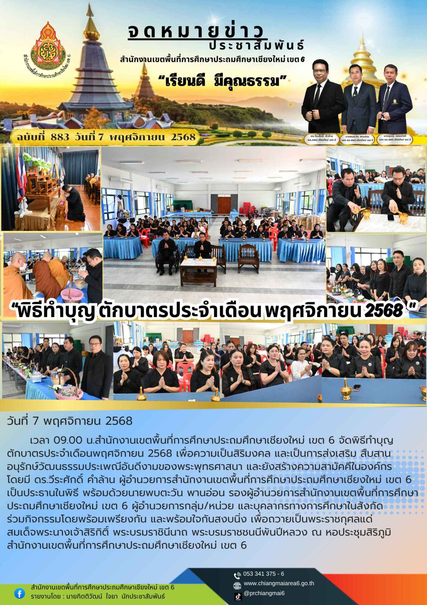 วันที่ 7 พฤศจิกายน 2568 เวลา 09.00 น.สำนักงานเขตพื้นที่การศึกษาประถมศึกษาเชียงใหม่ เขต 6 จัดพิธีทำบุญตักบาตรประจำเดือนพฤศจิกายน 2568 เพื่อความเป็นสิริมงคล และเป็นการส่งเสริม สืบสาน อนุรักษ์วัฒนธรรมประเพณีอันดีงามของพระพุทธศาสนา และยังสร้างความสามัคคีในองค์กร โดยมี ดร.วีระศักดิ์ คำล้าน ผู้อำนวยการสำนักงานเขตพื้นที่การศึกษาประถมศึกษาเชียงใหม่ เขต 6 เป็นประธานในพิธี พร้อมด้วยนายพบตะวัน พานอ่อน รองผู้อำนวยการสำนักงานเขตพื้นที่การศึกษาประถมศึกษาเชียงใหม่ เขต 6 ผู้อำนวยการกลุ่ม/หน่วย และบุคลากรทางการศึกษาในสังกัด ร่วมกิจกรรมโดยพร้อมเพรียงกัน และพร้อมใจกันสงบนิ่ง เพื่อถวายเป็นพระราชกุศลแด่ สมเด็จพระนางเจ้าสิริกิติ์ พระบรมราชินีนาถ พระบรมราชชนนีพันปีหลวง ณ หอประชุมสิริภูมิ สำนักงานเขตพื้นที่การศึกษาประถมศึกษาเชียงใหม่ เขต 6