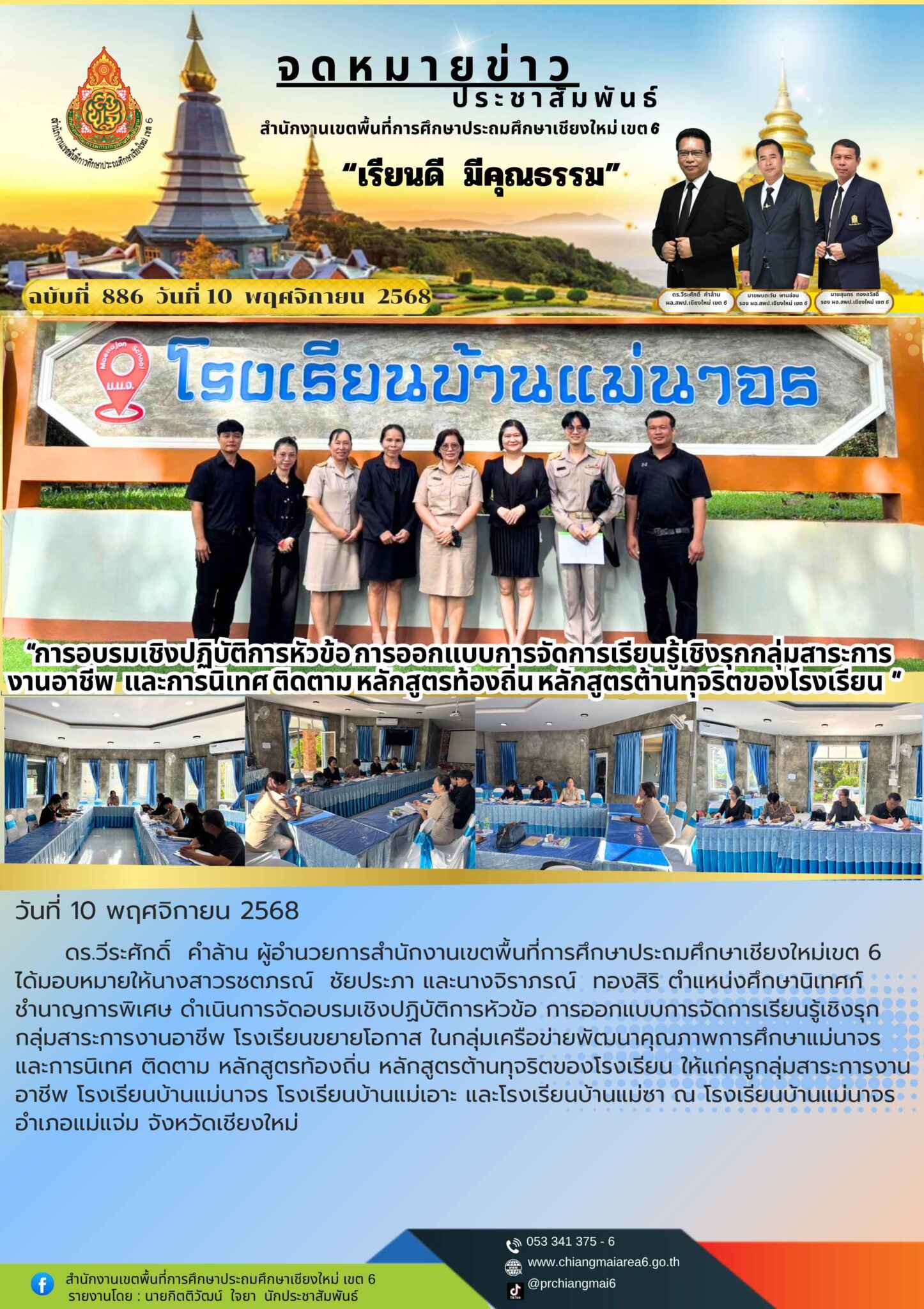 ดร.วีระศักดิ์ คำล้าน ผู้อำนวยการสำนักงานเขตพื้นที่การศึกษาประถมศึกษาเชียงใหม่เขต 6 ได้มอบหมายให้นางสาวรชตภรณ์ ชัยประภา และนางจิราภรณ์ ทองสิริ ตำแหน่งศึกษานิเทศก์ชำนาญการพิเศษ ดำเนินการจัดอบรมเชิงปฏิบัติการหัวข้อ การออกแบบการจัดการเรียนรู้เชิงรุกกลุ่มสาระการงานอาชีพ โรงเรียนขยายโอกาส ในกลุ่มเครือข่ายพัฒนาคุณภาพการศึกษาแม่นาจร และการนิเทศ ติดตาม หลักสูตรท้องถิ่น หลักสูตรต้านทุจริตของโรงเรียน ให้แก่ครูกลุ่มสาระการงานอาชีพ โรงเรียนบ้านแม่นาจร โรงเรียนบ้านแม่เอาะ และโรงเรียนบ้านแม่ซา ณ โรงเรียนบ้านแม่นาจร อำเภอแม่แจ่ม จังหวัดเชียงใหม่