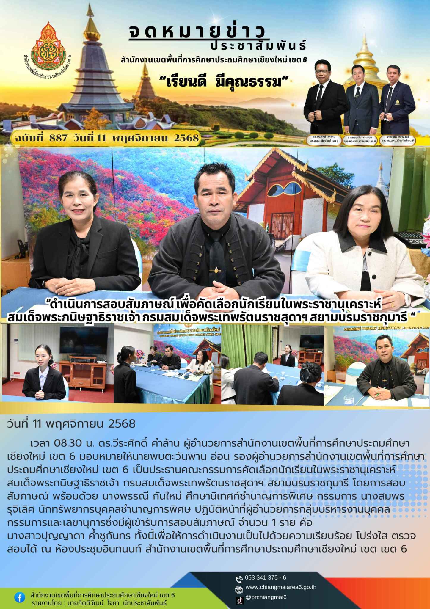 วันที่ 11 พฤศจิกายน 2568 เวลา 08.30 น. ดร.วีระศักดิ์ คำล้าน ผู้อำนวยการสำนักงานเขตพื้นที่การศึกษาประถมศึกษาเชียงใหม่ เขต 6 มอบหมายให้นายพบตะวันพาน อ่อน รองผู้อำนวยการสำนักงานเขตพื้นที่การศึกษาประถมศึกษาเชียงใหม่ เขต 6 เป็นประธานคณะกรรมการคัดเลือกนักเรียนในพระราชานุเคราะห์สมเด็จพระกนิษฐาธิราชเจ้า กรมสมเด็จพระเทพรัตนราชสุดาฯ สยามบรมราชกุมารี โดยการสอบสัมภาษณ์ พร้อมด้วย นางพรรณี กันใหม่ ศึกษานิเทศก์ชำนาญการพิเศษ กรรมการ นางสมพร รุจิเลิศ นักทรัพยากรบุคคลชำนาญการพิศษ ปฏิบัติหน้าที่ผู้อำนวยการกลุ่มบริหารงานบุคคล กรรมการและเลขานุการซึ่งมีผู้เข้ารับการสอบสัมภาษณ์ จำนวน 1 ราย คือ นางสาวปุญญาดา ค้ำชูกันทร ทั้งนี้เพื่อให้การดำเนินงานเป็นไปด้วยความเรียบร้อย โปร่งใส ตรวจสอบได้ ณ ห้องประชุมอินทนนท์ สำนักงานเขตพื้นที่การศึกษาประถมศึกษาเชียงใหม่ เขต เขต 6
