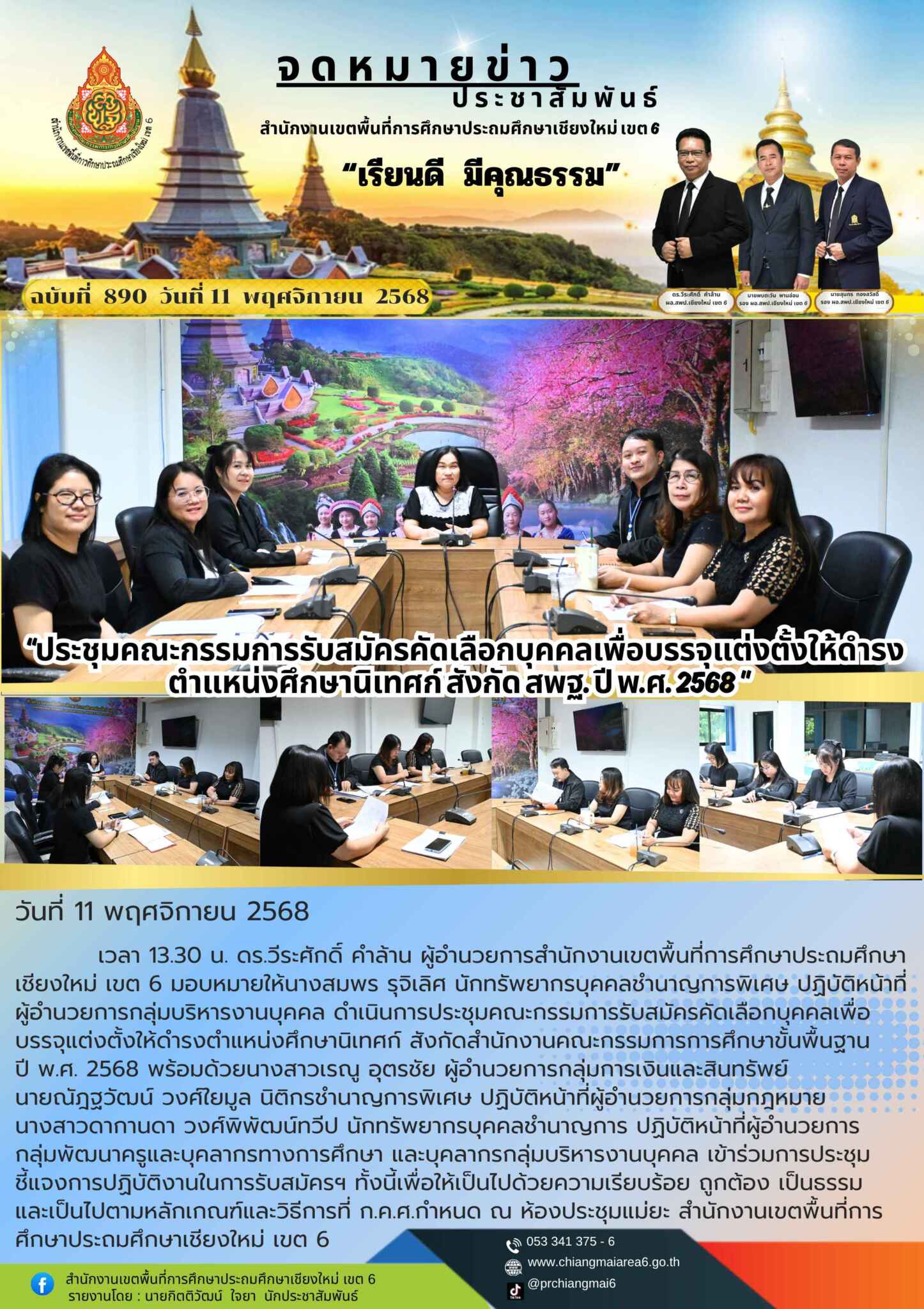 วันที่ 11 พฤศจิกายน 2568 เวลา 13.30 น. ดร.วีระศักดิ์ คำล้าน ผู้อำนวยการสำนักงานเขตพื้นที่การศึกษาประถมศึกษาเชียงใหม่ เขต 6 มอบหมายให้นางสมพร รุจิเลิศ นักทรัพยากรบุคคลชำนาญการพิเศษ ปฏิบัติหน้าที่ ผู้อำนวยการกลุ่มบริหารงานบุคคล ดำเนินการประชุมคณะกรรมการรับสมัครคัดเลือกบุคคลเพื่อบรรจุแต่งตั้งให้ดำรงตำแหน่งศึกษานิเทศก์ สังกัดสำนักงานคณะกรรมการการศึกษาขั้นพื้นฐาน ปี พ.ศ. 2568 พร้อมด้วยนางสาวเรณู อุตรชัย ผู้อำนวยการกลุ่มการเงินและสินทรัพย์ นายณัฎฐวัฒน์ วงศ์ใยมูล นิติกรชำนาญการพิเศษ ปฏิบัติหน้าที่ผู้อำนวยการกลุ่มกฎหมาย นางสาวดากานดา วงศ์พิพัฒน์ทวีป นักทรัพยากรบุคคลชำนาญการ ปฏิบัติหน้าที่ผู้อำนวยการกลุ่มพัฒนาครูและบุคลากรทางการศึกษา และบุคลากรกลุ่มบริหารงานบุคคล เข้าร่วมการประชุมชี้แจงการปฏิบัติงานในการรับสมัครฯ ทั้งนี้เพื่อให้เป็นไปด้วยความเรียบร้อย ถูกต้อง เป็นธรรม และเป็นไปตามหลักเกณฑ์และวิธีการที่ ก.ค.ศ.กำหนด ณ ห้องประชุมแม่ยะ สำนักงานเขตพื้นที่การศึกษาประถมศึกษาเชียงใหม่ เขต 6