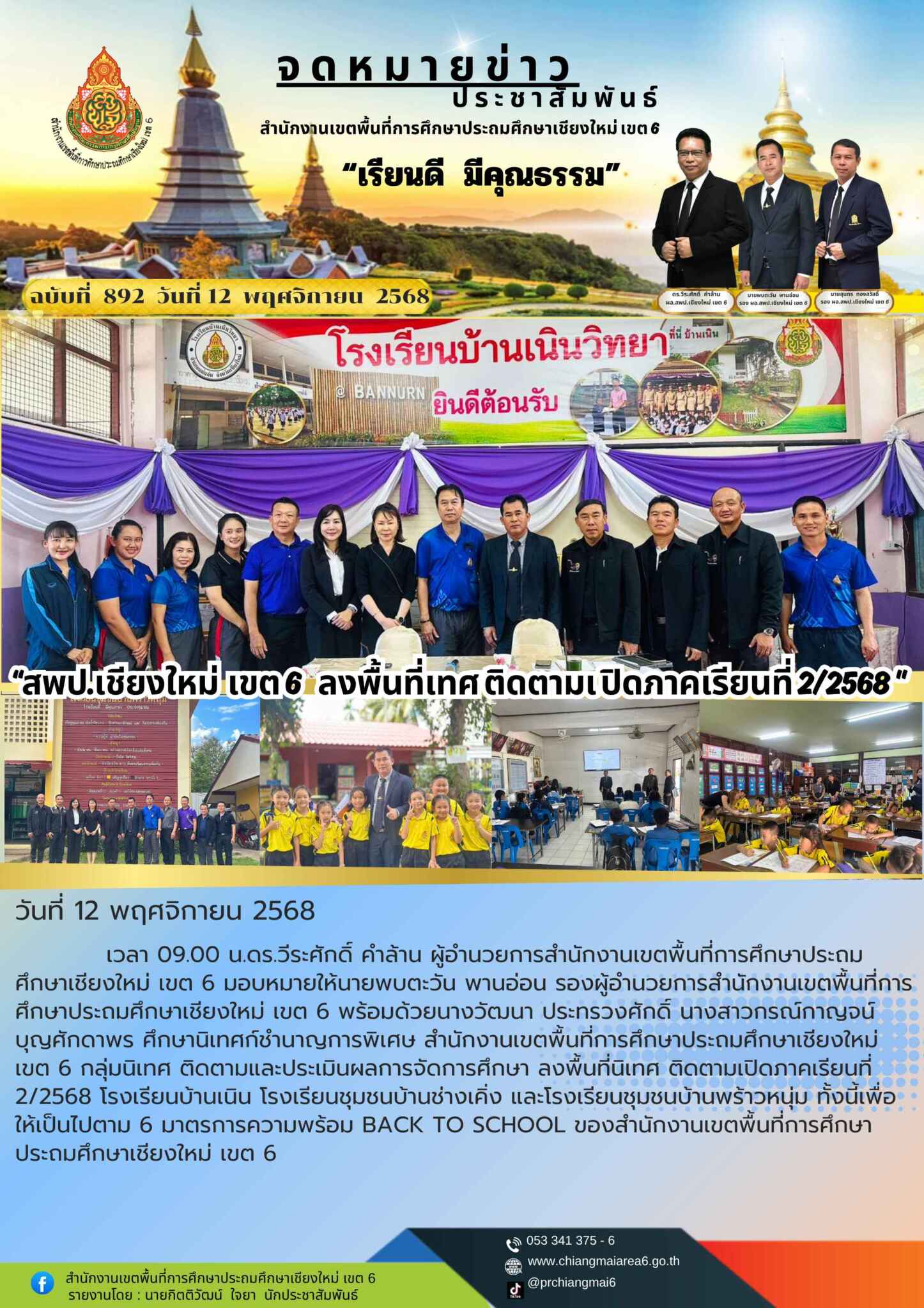วันที่ 12 พฤศจิกายน 2568 เวลา 09.00 น.ดร.วีระศักดิ์ คำล้าน ผู้อำนวยการสำนักงานเขตพื้นที่การศึกษาประถมศึกษาเชียงใหม่ เขต 6 มอบหมายให้นายพบตะวัน พานอ่อน รองผู้อำนวยการสำนักงานเขตพื้นที่การศึกษาประถมศึกษาเชียงใหม่ เขต 6 พร้อมด้วยนางวัฒนา ประทรวงศักดิ์ นางสาวกรณ์กาญจน์ บุญศักดาพร ศึกษานิเทศก์ชำนาญการพิเศษ สำนักงานเขตพื้นที่การศึกษาประถมศึกษาเชียงใหม่ เขต 6 กลุ่มนิเทศ ติดตามและประเมินผลการจัดการศึกษา ลงพื้นที่นิเทศ ติดตามเปิดภาคเรียนที่ 2/2568 โรงเรียนบ้านเนิน โรงเรียนชุมชนบ้านช่างเคิ่ง และโรงเรียนชุมชนบ้านพร้าวหนุ่ม ทั้งนี้เพื่อให้เป็นไปตาม 6 มาตรการความพร้อม BACK TO SCHOOL ของสำนักงานเขตพื้นที่การศึกษาประถมศึกษาเชียงใหม่ เขต 6
