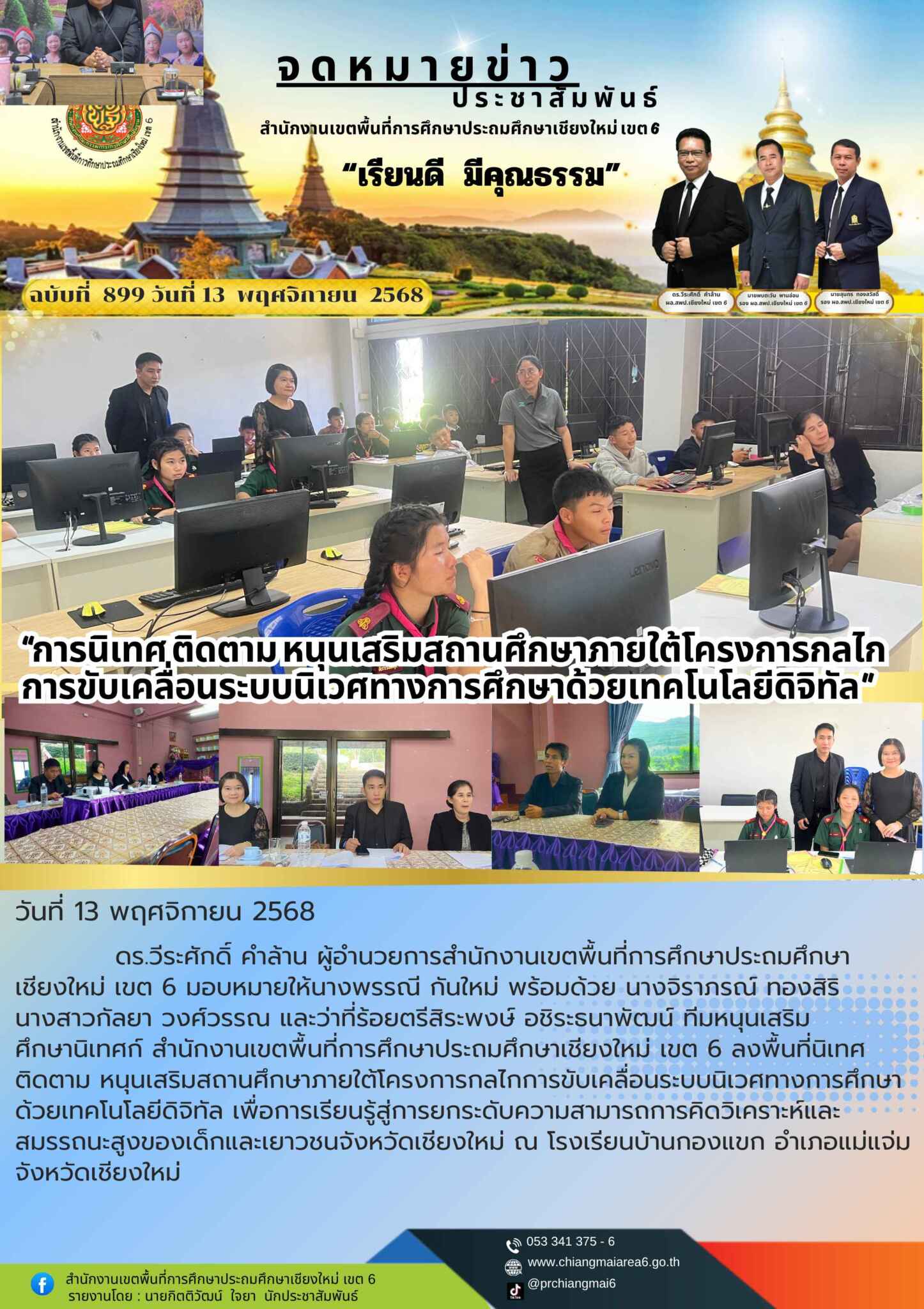 วันที่ 13 พฤศจิกายน 2568 ดร.วีระศักดิ์ คำล้าน ผู้อำนวยการสำนักงานเขตพื้นที่การศึกษาประถมศึกษาเชียงใหม่ เขต 6 มอบหมายให้นางพรรณี กันใหม่ พร้อมด้วย นางจิราภรณ์ ทองสิริ นางสาวกัลยา วงศ์วรรณ และว่าที่ร้อยตรีสิระพงษ์ อชิระธนาพัฒน์ ทีมหนุนเสริมศึกษานิเทศก์ สำนักงานเขตพื้นที่การศึกษาประถมศึกษาเชียงใหม่ เขต 6 ลงพื้นที่นิเทศ ติดตาม หนุนเสริมสถานศึกษาภายใต้โครงการกลไกการขับเคลื่อนระบบนิเวศทางการศึกษาด้วยเทคโนโลยีดิจิทัล เพื่อการเรียนรู้สู่การยกระดับความสามารถการคิดวิเคราะห์และสมรรถนะสูงของเด็กและเยาวชนจังหวัดเชียงใหม่ ณ โรงเรียนบ้านกองแขก อำเภอแม่แจ่ม จังหวัดเชียงใหม่