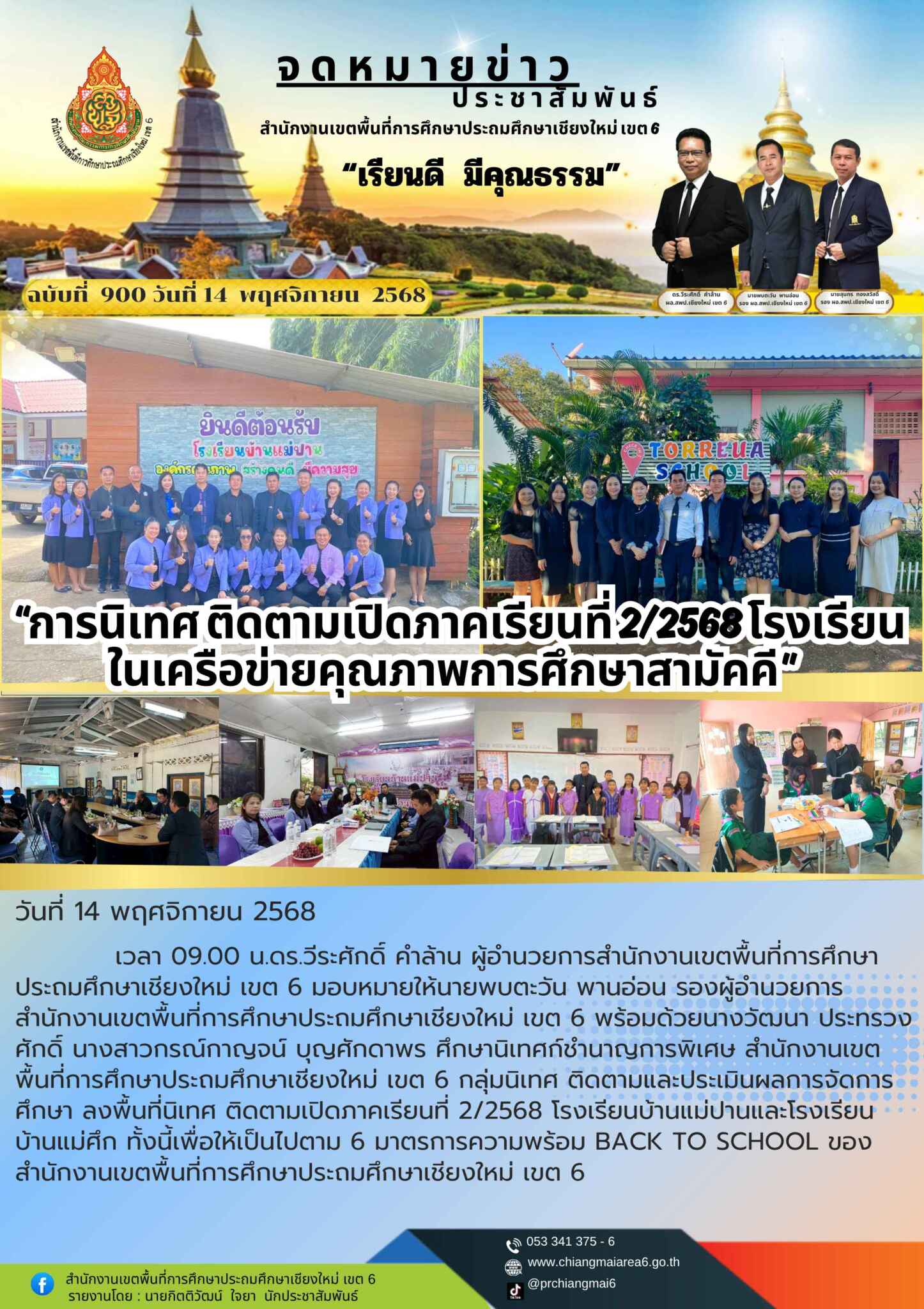 วันที่ 14 พฤศจิกายน 2568 เวลา 09.00 น.ดร.วีระศักดิ์ คำล้าน ผู้อำนวยการสำนักงานเขตพื้นที่การศึกษาประถมศึกษาเชียงใหม่ เขต 6 มอบหมายให้นายพบตะวัน พานอ่อน รองผู้อำนวยการสำนักงานเขตพื้นที่การศึกษาประถมศึกษาเชียงใหม่ เขต 6 พร้อมด้วยนางวัฒนา ประทรวงศักดิ์ นางสาวกรณ์กาญจน์ บุญศักดาพร ศึกษานิเทศก์ชำนาญการพิเศษ สำนักงานเขตพื้นที่การศึกษาประถมศึกษาเชียงใหม่ เขต 6 กลุ่มนิเทศ ติดตามและประเมินผลการจัดการศึกษา ลงพื้นที่นิเทศ ติดตามเปิดภาคเรียนที่ 2/2568 โรงเรียนบ้านแม่ปานและโรงเรียนบ้านแม่ศึก ทั้งนี้เพื่อให้เป็นไปตาม 6 มาตรการความพร้อม BACK TO SCHOOL ของสำนักงานเขตพื้นที่การศึกษาประถมศึกษาเชียงใหม่ เขต 6