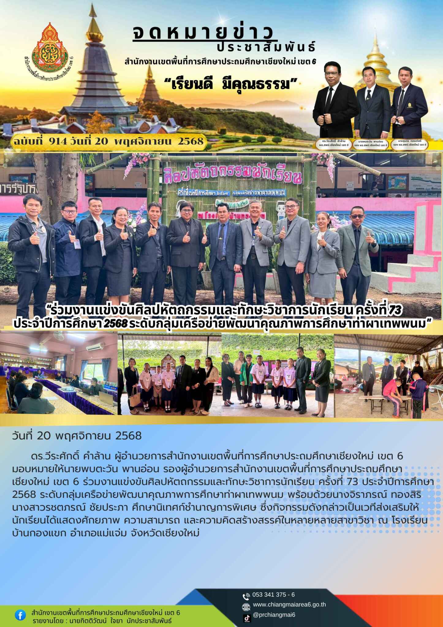 วันที่ 20 พฤศจิกายน 2568 ดร.วีระศักดิ์ คำล้าน ผู้อำนวยการสำนักงานเขตพื้นที่การศึกษาประถมศึกษาเชียงใหม่ เขต 6 มอบหมายให้นายพบตะวัน พานอ่อน รองผู้อำนวยการสำนักงานเขตพื้นที่การศึกษาประถมศึกษาเชียงใหม่ เขต 6 ร่วมงานแข่งขันศิลปหัตถกรรมและทักษะวิชาการนักเรียน ครั้งที่ 73 ประจำปีการศึกษา 2568 ระดับกลุ่มเครือข่ายพัฒนาคุณภาพการศึกษาท่าผาเทพพนม พร้อมด้วยนางจิราภรณ์ ทองสิริ นางสาวรชตภรณ์ ชัยประภา ศึกษานิเทศก์ชำนาญการพิเศษ ซึ่งกิจกรรมดังกล่าวเป็นเวทีส่งเสริมให้นักเรียนได้แสดงศักยภาพ ความสามารถ และความคิดสร้างสรรค์ในหลายหลายสาขาวิชา ณ โรงเรียนบ้านกองแขก อำเภอแม่แจ่ม จังหวัดเชียงใหม่