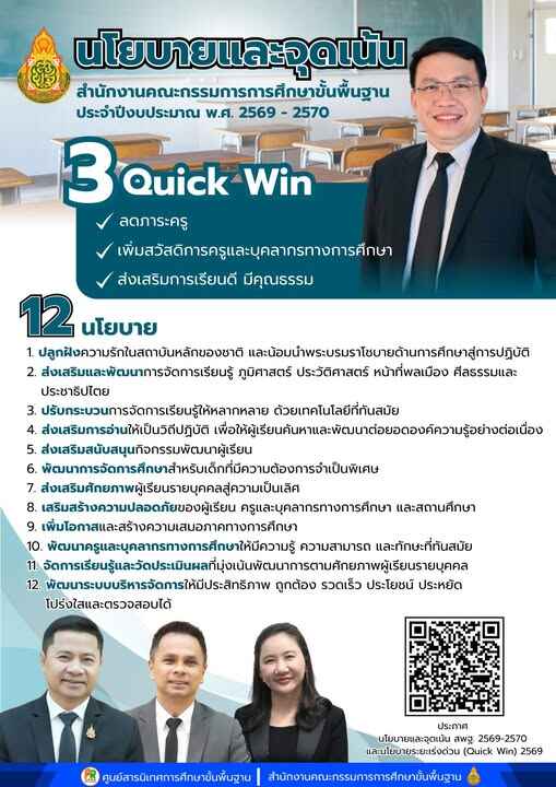 นโยบายและจุดเน้นของสำนักงานคณะกรรมการการศึกษาขั้นพื้นฐาน ประจำปีงบประมาณ พ.ศ. 2569 – 2570 และนโยบายระยะเร่งด่วน (Quick Win) ประจำปีงบประมาณ พ.ศ. 2569
