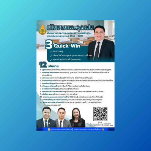 “ประชาสัมพันธ์ ประกาศสำนักงานคณะกรรมการการศึกษาขั้นพื้นฐาน เรื่อง นโยบายและจุดเน้นของ สพฐ. ประจำปีงบประมาณ พ.ศ. 2569-2570 และนโยบายเร่งด่วน (Quick Win) ประจำปีงบประมาณ 2569
