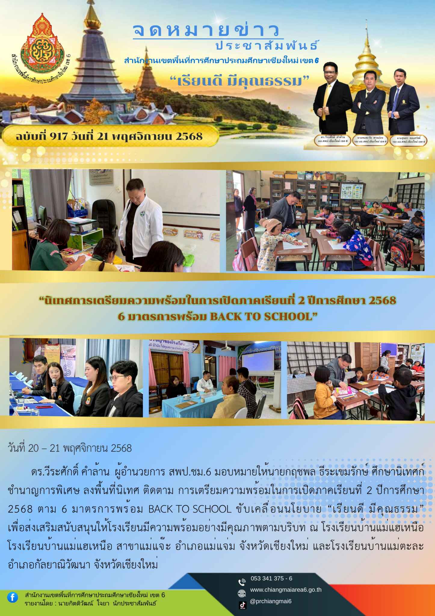 วันที่ 21 พฤศจิกายน 2568 ดร.วีระศักดิ์ คำดีลาน ผู้อำนวยการ สพป.ชม.6 มอบหมายให้ นายกฤษพล ธีระชนารักษ์ ศึกษานิเทศก์ชำนาญการพิเศษ ลงพื้นที่นิเทศ ติดตาม การเตรียมความพร้อมในการเปิดภาคเรียนที่ 2 ปีการศึกษา 2568 ตาม 6 มาตรการพร้อม BACK TO SCHOOL ขับเคลื่อนนโยบาย “เรียนดี มีคุณภาพ” เพื่อส่งเสริมสนับสนุนให้โรงเรียนมีความพร้อมอย่างมีคุณภาพตามบริบท ณ โรงเรียนบ้านแม่แตะเหนือ โรงเรียนบ้านแม่หะเหนือ สาขาแม่แจ่มจะ อำเภอแม่แจ่ม จังหวัดเชียงใหม่ และโรงเรียนบ้านแม่ตะละ อำเภอกัลยาณิวัฒนา จังหวัดเชียงใหม่