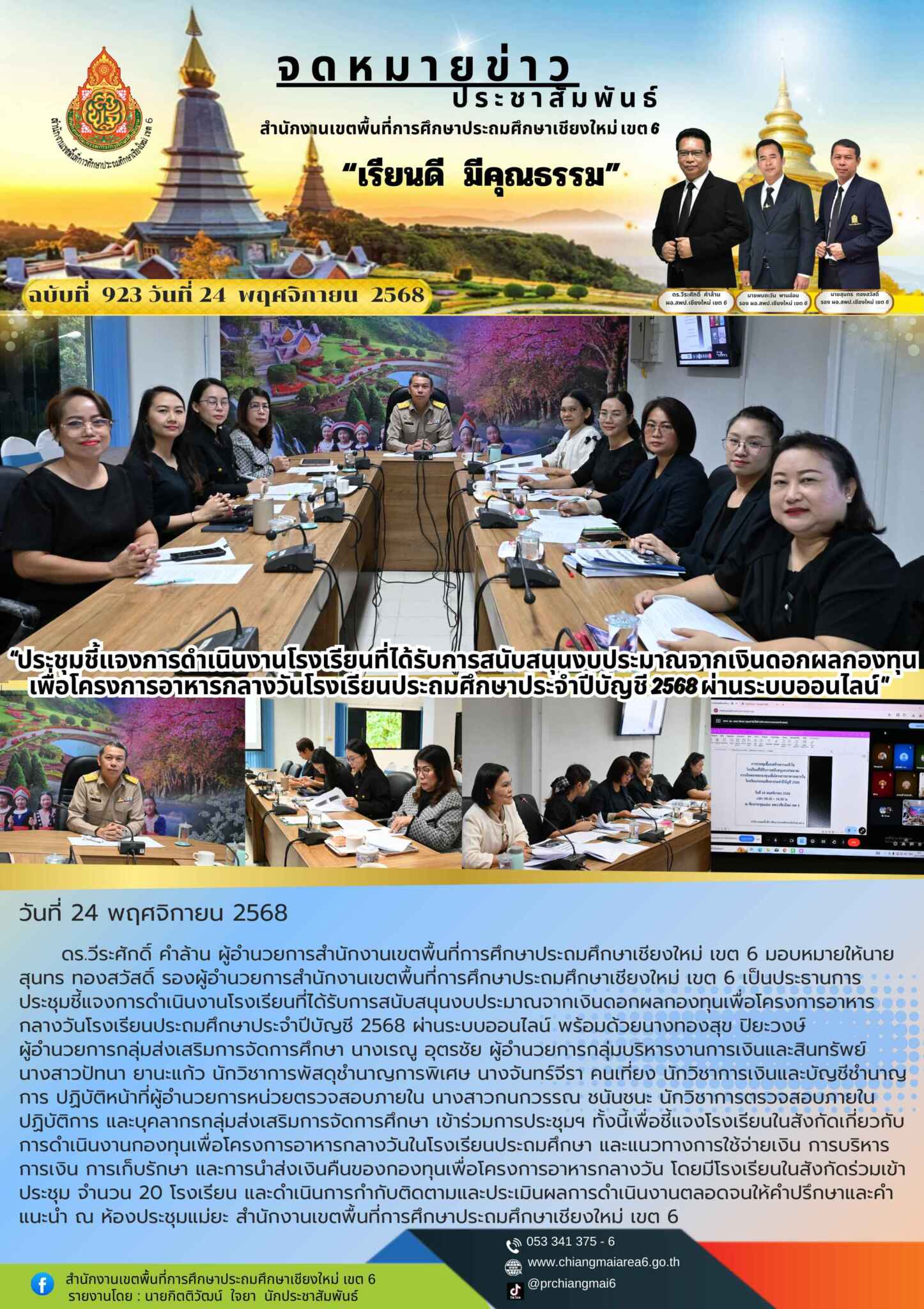 วันที่ 24 พฤศจิกายน 2568 ดร.วีระศักดิ์ คำล้าน ผู้อำนวยการสำนักงานเขตพื้นที่การศึกษาประถมศึกษาเชียงใหม่ เขต 6 มอบหมายให้นายสุนทร ทองสวัสดิ์ รองผู้อำนวยการสำนักงานเขตพื้นที่การศึกษาประถมศึกษาเชียงใหม่ เขต 6 เป็นประธานการประชุมชี้แจงการดำเนินงานโรงเรียนที่ได้รับการสนับสนุนงบประมาณจากเงินดอกผลกองทุนเพื่อโครงการอาหารกลางวันโรงเรียนประถมศึกษาประจำปีบัญชี 2568 ผ่านระบบออนไลน์ พร้อมด้วยนางทองสุข ปิยะวงษ์ ผู้อำนวยการกลุ่มส่งเสริมการจัดการศึกษา นางเรณู อุตรชัย ผู้อำนวยการกลุ่มบริหารงานการเงินและสินทรัพย์ นางสาวปัทนา ยานะแก้ว นักวิชาการพัสดุชำนาญการพิเศษ นางจันทร์จีรา คนเที่ยง นักวิชาการเงินและบัญชีชำนาญการ ปฏิบัติหน้าที่ผู้อำนวยการหน่วยตรวจสอบภายใน นางสาวกนกวรรณ ชนันชนะ นักวิชาการตรวจสอบภายในปฏิบัติการ และบุคลากรกลุ่มส่งเสริมการจัดการศึกษา เข้าร่วมการประชุมฯ ทั้งนี้เพื่อชี้แจงโรงเรียนในสังกัดเกี่ยวกับการดำเนินงานกองทุนเพื่อโครงการอาหารกลางวันในโรงเรียนประถมศึกษา และแนวทางการใช้จ่ายเงิน การบริหารการเงิน การเก็บรักษา และการนำส่งเงินคืนของกองทุนเพื่อโครงการอาหารกลางวัน โดยมีโรงเรียนในสังกัดร่วมเข้าประชุม จำนวน 20 โรงเรียน และดำเนินการกำกับติดตามและประเมินผลการดำเนินงานตลอดจนให้คำปรึกษาและคำแนะนำ ณ ห้องประชุมแม่ยะ สำนักงานเขตพื้นที่การศึกษาประถมศึกษาเชียงใหม่ เขต 6