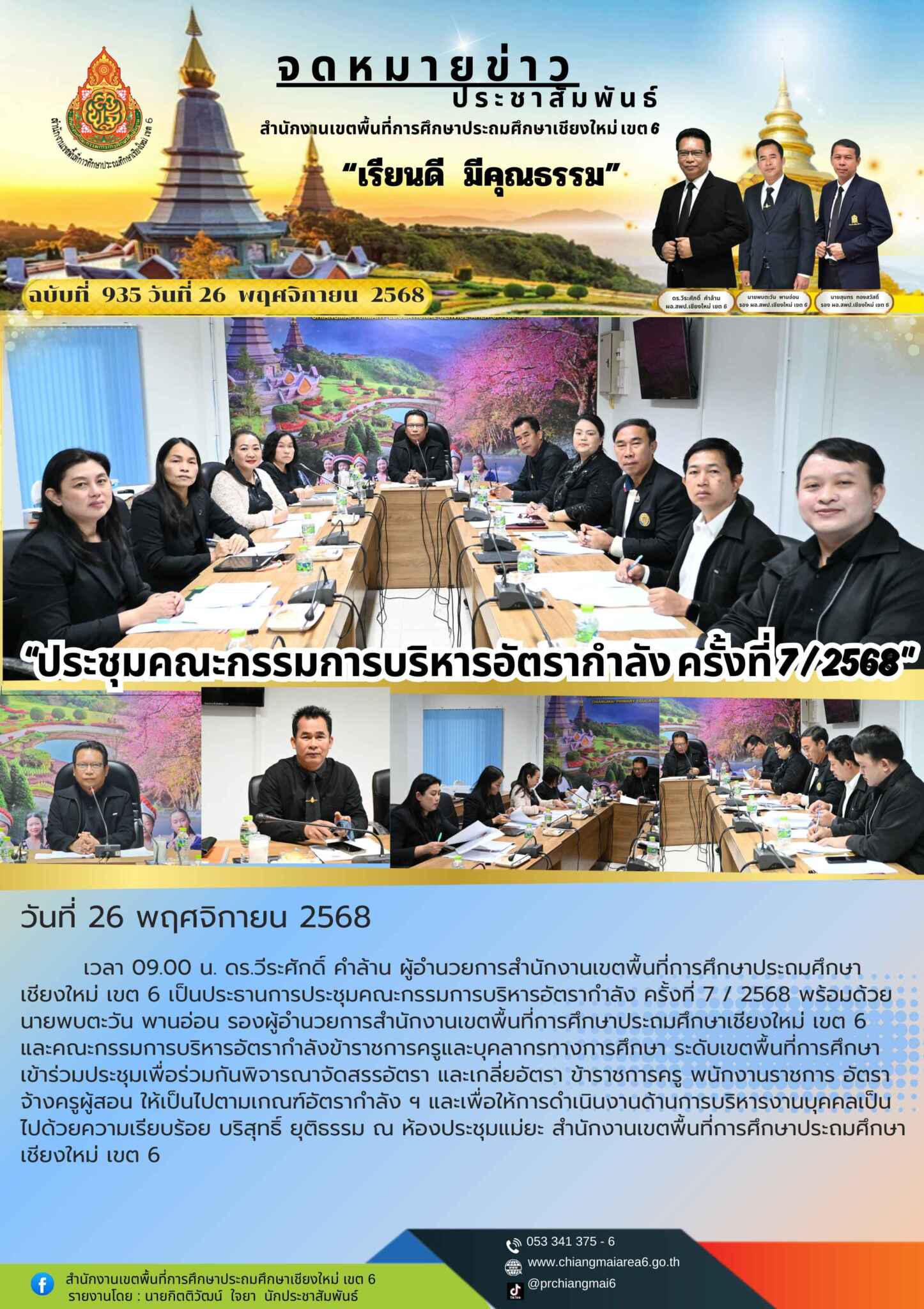 วันที่ 26 พฤศจิกายน 2568 เวลา 09.00 น. ดร.วีระศักดิ์ คำล้าน ผู้อำนวยการสำนักงานเขตพื้นที่การศึกษาประถมศึกษาเชียงใหม่ เขต 6 เป็นประธานการประชุมคณะกรรมการบริหารอัตรากำลัง ครั้งที่ 7 / 2568 พร้อมด้วยนายพบตะวัน พานอ่อน รองผู้อำนวยการสำนักงานเขตพื้นที่การศึกษาประถมศึกษาเชียงใหม่ เขต 6 และคณะกรรมการบริหารอัตรากำลังข้าราชการครูและบุคลากรทางการศึกษา ระดับเขตพื้นที่การศึกษา เข้าร่วมประชุมเพื่อร่วมกันพิจารณาจัดสรรอัตรา และเกลี่ยอัตรา ข้าราชการครู พนักงานราชการ อัตราจ้างครูผู้สอน ให้เป็นไปตามเกณฑ์อัตรากำลัง ฯ และเพื่อให้การดำเนินงานด้านการบริหารงานบุคคลเป็นไปด้วยความเรียบร้อย บริสุทธิ์ ยุติธรรม ณ ห้องประชุมแม่ยะ สำนักงานเขตพื้นที่การศึกษาประถมศึกษาเชียงใหม่ เขต 6