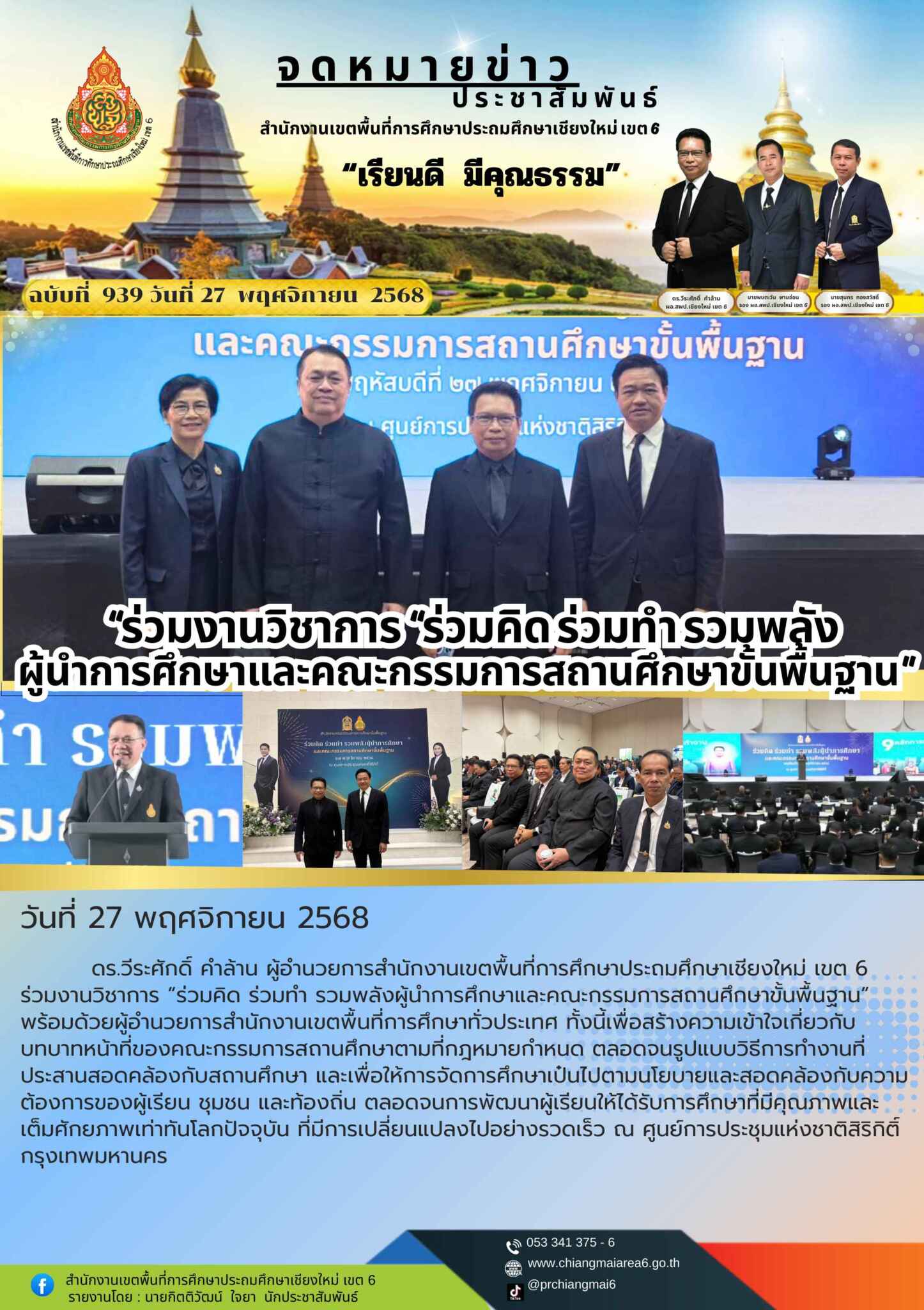 วันที่ 27 พฤศจิกายน 2568 ดร.วีระศักดิ์ คำล้าน ผู้อำนวยการสำนักงานเขตพื้นที่การศึกษาประถมศึกษาเชียงใหม่ เขต 6 ร่วมงานวิชาการ “ร่วมคิด ร่วมทำ รวมพลังผู้นำการศึกษาและคณะกรรมการสถานศึกษาขั้นพื้นฐาน” พร้อมด้วยผู้อำนวยการสำนักงานเขตพื้นที่การศึกษาทั่วประเทศ ทั้งนี้เพื่อสร้างความเข้าใจเกี่ยวกับบทบาทหน้าที่ของคณะกรรมการสถานศึกษาตามที่กฎหมายกำหนด ตลอดจนรูปแบบวิธีการทำงานที่ประสานสอดคล้องกับสถานศึกษา และเพื่อให้การจัดการศึกษาเป๋นไปตามนโยบายและสอดคล้องกับความต้องการของผู้เรียน ชุมชน และท้องถิ่น ตลอดจนการพัฒนาผู้เรียนให้ได้รับการศึกษาที่มีคุณภาพและเต็มศักยภาพเท่าทันโลกปัจจุบัน ที่มีการเปลี่ยนแปลงไปอย่างรวดเร็ว ณ ศูนย์การประชุมแห่งชาติสิริกิติ์ กรุงเทพมหานคร