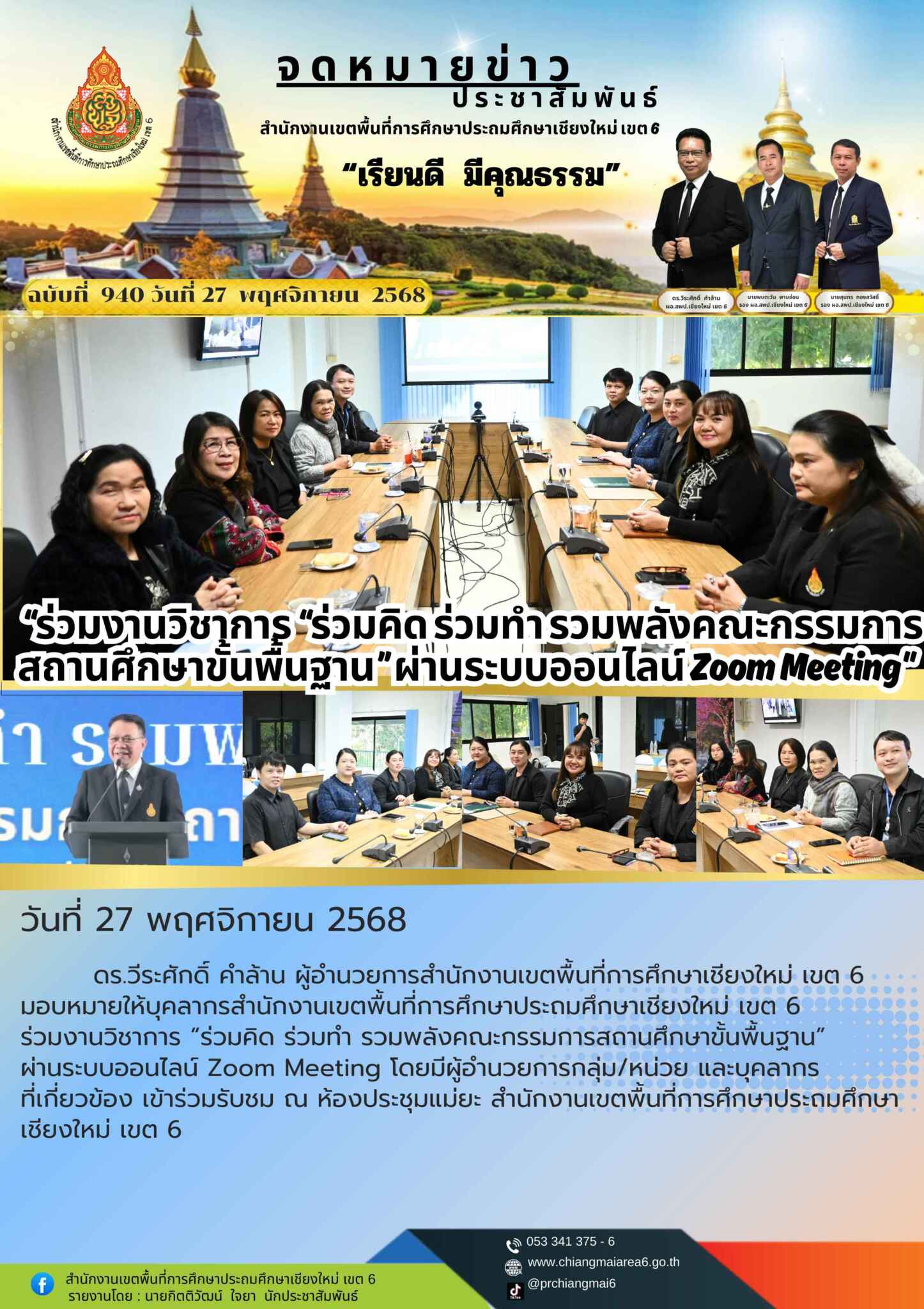วันที่ 27 พฤศจิกายน 2568 ดร.วีระศักดิ์ คำล้าน ผู้อำนวยการสำนักงานเขตพื้นที่การศึกษาเชียงใหม่ เขต 6 มอบหมายให้บุคลากรสำนักงานเขตพื้นที่การศึกษาประถมศึกษาเชียงใหม่ เขต 6 ร่วมงานวิชาการ “ร่วมคิด ร่วมทำ รวมพลังคณะกรรมการสถานศึกษาขั้นพื้นฐาน” ผ่านระบบออนไลน์ Zoom Meeting โดยมีผู้อำนวยการกลุ่ม/หน่วย และบุคลากรที่เกี่ยวข้อง เข้าร่วมรับชม ณ ห้องประชุมแม่ยะ สำนักงานเขตพื้นที่การศึกษาประถมศึกษาเชียงใหม่ เขต 6