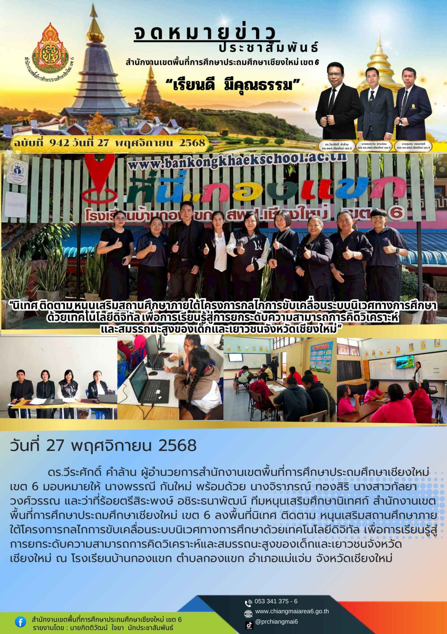 วันที่ 27 พฤศจิกายน 2568 ดร.วีระศักดิ์ คำล้าน ผู้อำนวยการสำนักงานเขตพื้นที่การศึกษาประถมศึกษาเชียงใหม่ เขต 6 มอบหมายให้ นางพรรณี กันใหม่ พร้อมด้วย นางจิราภรณ์ ทองสิริ นางสาวกัลยา วงศ์วรรณ และว่าที่ร้อยตรีสิระพงษ์ อชิระธนาพัฒน์ ทีมหนุนเสริมศึกษานิเทศก์ สำนักงานเขตพื้นที่การศึกษาประถมศึกษาเชียงใหม่ เขต 6 ลงพื้นที่นิเทศ ติดตาม หนุนเสริมสถานศึกษาภายใต้โครงการกลไกการขับเคลื่อนระบบนิเวศทางการศึกษาด้วยเทคโนโลยีดิจิทัล เพื่อการเรียนรู้สู่การยกระดับความสามารถการคิดวิเคราะห์และสมรรถนะสูงของเด็กและเยาวชนจังหวัดเชียงใหม่ ณ โรงเรียนบ้านกองแขก ตำบลกองแขก อำเภอแม่แจ่ม จังหวัดเชียงใหม่