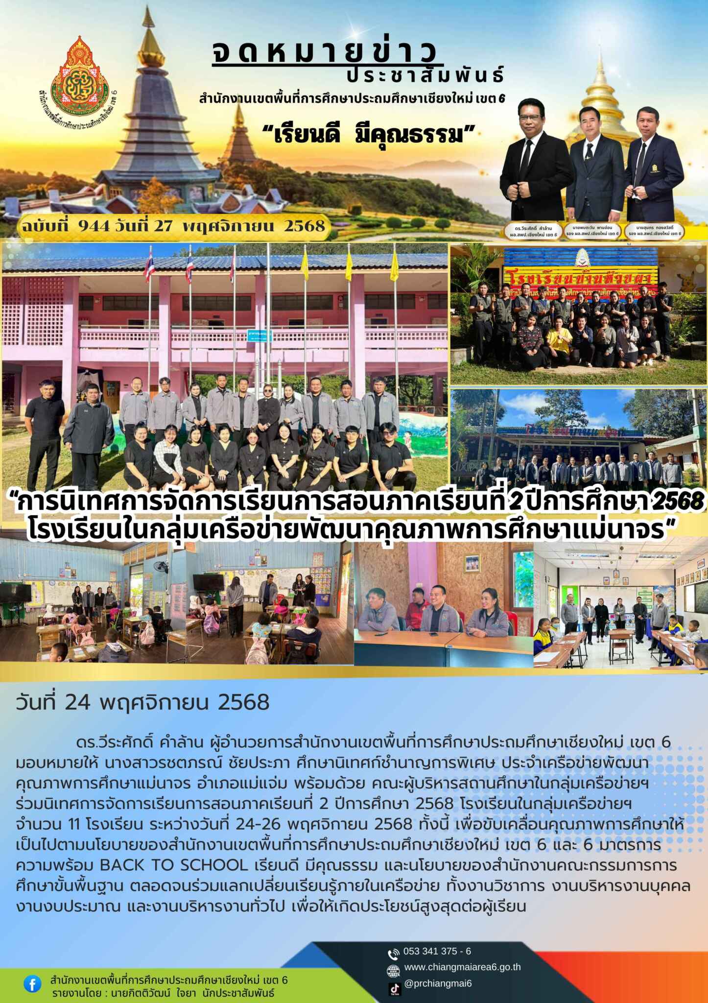 วันที่ 24 พฤศจิกายน 2568 ดร.วีระศักดิ์ คำล้าน ผู้อำนวยการสำนักงานเขตพื้นที่การศึกษาประถมศึกษาเชียงใหม่ เขต 6 มอบหมายให้ นางสาวรชตภรณ์ ชัยประภา ศึกษานิเทศก์ชำนาญการพิเศษ ประจำเครือข่ายพัฒนาคุณภาพการศึกษาแม่นาจร อำเภอแม่แจ่ม พร้อมด้วย คณะผู้บริหารสถานศึกษาในกลุ่มเครือข่ายฯ ร่วมนิเทศการจัดการเรียนการสอนภาคเรียนที่ 2 ปีการศึกษา 2568 โรงเรียนในกลุ่มเครือข่ายฯ จำนวน 11 โรงเรียน ระหว่างวันที่ 24-26 พฤศจิกายน 2568 ทั้งนี้ เพื่อขับเคลื่อนคุณภาพการศึกษาให้เป็นไปตามนโยบายของสำนักงานเขตพื้นที่การศึกษาประถมศึกษาเชียงใหม่ เขต 6 และ 6 มาตรการความพร้อม BACK TO SCHOOL เรียนดี มีคุณธรรม และนโยบายของสำนักงานคณะกรรมการการศึกษาขั้นพื้นฐาน ตลอดจนร่วมแลกเปลี่ยนเรียนรู้ภายในเครือข่าย ทั้งงานวิชาการ งานบริหารงานบุคคล งานงบประมาณ และงานบริหารงานทั่วไป เพื่อให้เกิดประโยชน์สูงสุดต่อผู้เรียน