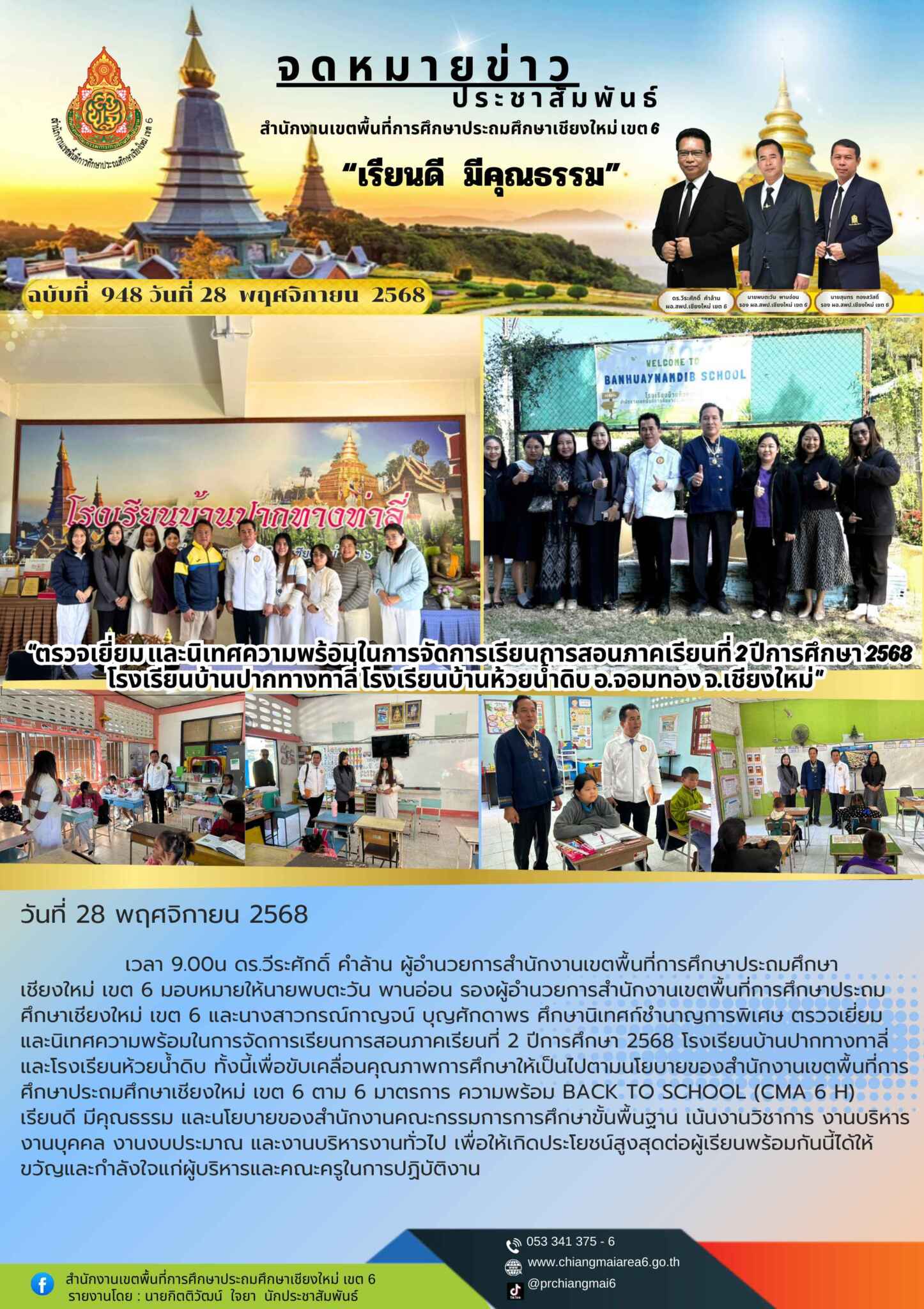 วันที่ 28 พฤศจิกายน 2568 เวลา 9.00น ดร.วีระศักดิ์ คำล้าน ผู้อำนวยการสำนักงานเขตพื้นที่การศึกษาประถมศึกษาเชียงใหม่ เขต 6 มอบหมายให้นายพบตะวัน พานอ่อน รองผู้อำนวยการสำนักงานเขตพื้นที่การศึกษาประถมศึกษาเชียงใหม่ เขต 6 และนางสาวกรณ์กาญจน์ บุญศักดาพร ศึกษานิเทศก์ชำนาญการพิเศษ ตรวจเยี่ยม และนิเทศความพร้อมในการจัดการเรียนการสอนภาคเรียนที่ 2 ปีการศึกษา 2568 โรงเรียนบ้านปากทางทาลี่ และโรงเรียนห้วยน้ำดิบ ทั้งนี้เพื่อขับเคลื่อนคุณภาพการศึกษาให้เป็นไปตามนโยบายของสำนักงานเขตพื้นที่การศึกษาประถมศึกษาเชียงใหม่ เขต 6 ตาม 6 มาตรการ ความพร้อม BACK TO SCHOOL (CMA 6 H) เรียนดี มีคุณธรรม และนโยบายของสำนักงานคณะกรรมการการศึกษาขั้นพื้นฐาน เน้นงานวิชาการ งานบริหารงานบุคคล งานงบประมาณ และงานบริหารงานทั่วไป เพื่อให้เกิดประโยชน์สูงสุดต่อผู้เรียนพร้อมกันนี้ได้ให้ขวัญและกำลังใจแก่ผู้บริหารและคณะครูในการปฏิบัติงาน