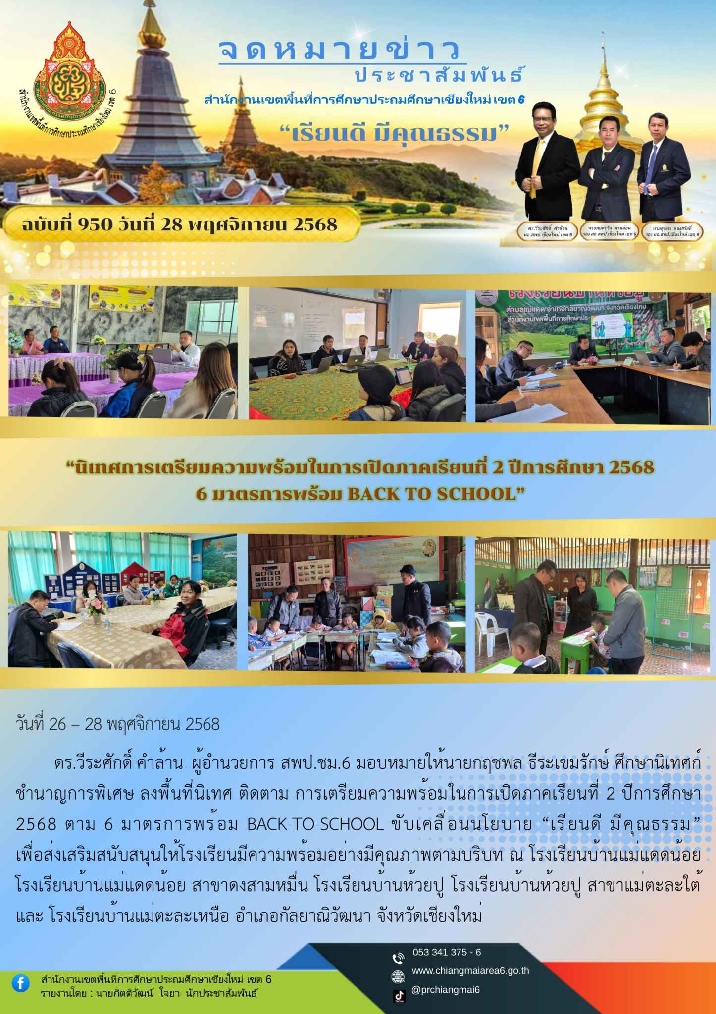 วันที่ 26-28 พฤศจิกายน 2568 ดร.วีระศักดิ์ คำล้าน ผู้อำนวยการสำนักงานเขตพื้นที่การศึกษาประถมศึกษาเชียงใหม่ เขต 6 มอบหมายให้ นายกฤษชพล ธีระเขมรักษ์ ศึกษานิเทศก์ชำนาญการพิเศษ ลงพื้นที่นิเทศ ติดตาม การเตรียมความพร้อมในการเปิดภาคเรียนที่ 2 ปีการศึกษา 2568 ตาม 6 มารการความพร้อม BACK TO SCHOOL ขับเคลื่อนนโยบาย “เรียนดี มีคุณธรรม” เพื่อส่งเสริมสนับสนุนให้โรงเรียนมีความพร้อมอย่างมีคุณภาพ่ตามบริบท ณ โรงเรียนบ้านแม่แดดน้อย โรงเรียนบ้านแม่แดดน้อย สาขาดงสามหมื่น โรงเรียนบ้านห้วยปู โรงเรียนบ้านห้วยปู สาขาแม่ตะละใต้ และโรงเรียนบ้านแม่ตะละเหนือ อำเภอกัลยาณิวัฒนา จังหวัดเชียงใหม่