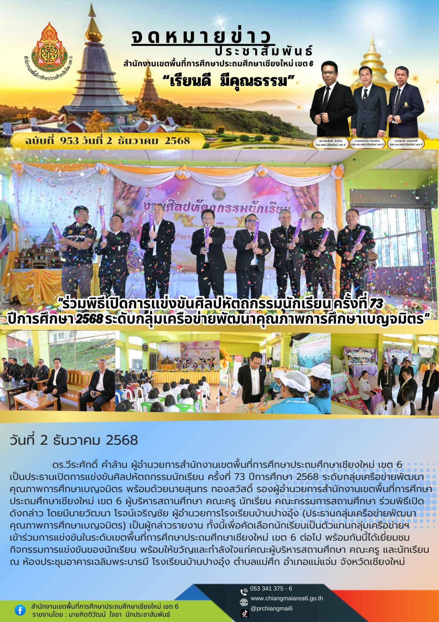 วันที่ 2 ธันวาคม 2568 ดร.วีระศักดิ์ คำล้าน ผู้อำนวยการสำนักงานเขตพื้นที่การศึกษาประถมศึกษาเชียงใหม่ เขต 6 เป็นประธานเปิดการแข่งขันศิลปหัตถกรรมนักเรียน ครั้งที่ 73 ปีการศึกษา 2568 ระดับกลุ่มเครือข่ายพัฒนาคุณภาพการศึกษาเบญจมิตร พร้อมด้วยนายสุนทร ทองสวัสดิ์ รองผู้อำนวยการสำนักงานเขตพื้นที่การศึกษาประถมศึกษาเชียงใหม่ เขต 6 ผู้บริหารสถานศึกษา คณะครู นักเรียน คณะกรรมการสถานศึกษา และผู้ปกครอง ร่วมพิธีเปิดดังกล่าว โดยมีนายวัฒนา โรจน์เจริญชัย ผู้อำนวยการโรงเรียนบ้านปางอุ๋ง (ประธานกลุ่มเครือข่ายพัฒนาคุณภาพการศึกษาเบญจมิตร) เป็นผู้กล่าวรายงาน ทั้งนี้เพื่อคัดเลือกนักเรียนเป็นตัวแทนกลุ่มเครือข่ายฯ เข้าร่วมการแข่งขันในระดับเขตพื้นที่การศึกษาประถมศึกษาเชียงใหม่ เขต 6 ต่อไป พร้อมกันนี้ได้เยี่ยมชมกิจกรรมการแข่งขันของนักเรียน พร้อมให้ขวัญและกำลังใจแก่คณะผู้บริหารสถานศึกษา คณะครู และนักเรียน ณ ห้องประชุมอาคารเฉลิมพระบารมี โรงเรียนบ้านปางอุ๋ง ตำบลแม่ศึก อำเภอแม่แจ่ม จังหวัดเชียงใหม่