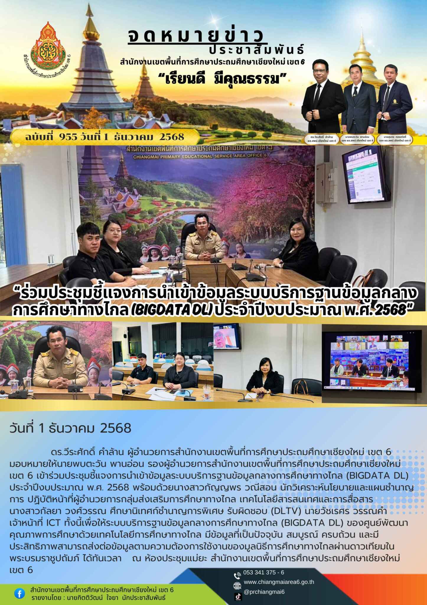 วันที่ 1 ธันวาคม 2568 ดร.วีระศักดิ์ คำล้าน ผู้อำนวยการสำนักงานเขตพื้นที่การศึกษาประถมศึกษาเชียงใหม่ เขต 6 มอบหมายให้นายพบตะวัน พานอ่อน รองผู้อำนวยการสำนักงานเขตพื้นที่การศึกษาประถมศึกษาเชียงใหม่ เขต 6 เข้าร่วมประชุมชี้แจงการนำเข้าข้อมูลระบบบริการฐานข้อมูลกลางการศึกษาทางไกล (BIGDATA DL) ประจำปีงบประมาณ พ.ศ. 2568 พร้อมด้วยนางสาวกัญญพร วณีสอน นักวิเคราะห์นโยบายและแผนชำนาญการ ปฏิบัติหน้าที่ผู้อำนวยการกลุ่มส่งเสริมการศึกษาทางไกล เทคโนโลยีสารสนเทศและการสื่อสาร นางสาวกัลยา วงศ์วรรณ ศึกษานิเทศก์ชำนาญการพิเศษ รับผิดชอบ (DLTV) นายวัชเรศร วรรณคำ เจ้าหน้าที่ ICT ทั้งนี้เพื่อให้ระบบบริการฐานข้อมูลกลางการศึกษาทางไกล (BIGDATA DL) ของศูนย์พัฒนาคุณภาพการศึกษาด้วยเทคโนโลยีการศึกษาทางไกล มีข้อมูลที่เป็นปัจจุบัน สมบูรณ์ ครบถ้วน และมีประสิทธิภาพสามารถส่งต่อข้อมูลตามความต้องการใช้งานของมูลนิธีการศึกษาทางไกลผ่านดาวเทียมในพระบรมราชูปถัมภ์ ได้ทันเวลา ณ ห้องประชุมแม่ยะ สำนักงานเขตพื้นที่การศึกษาประถมศึกษาเชียงใหม่ เขต 6