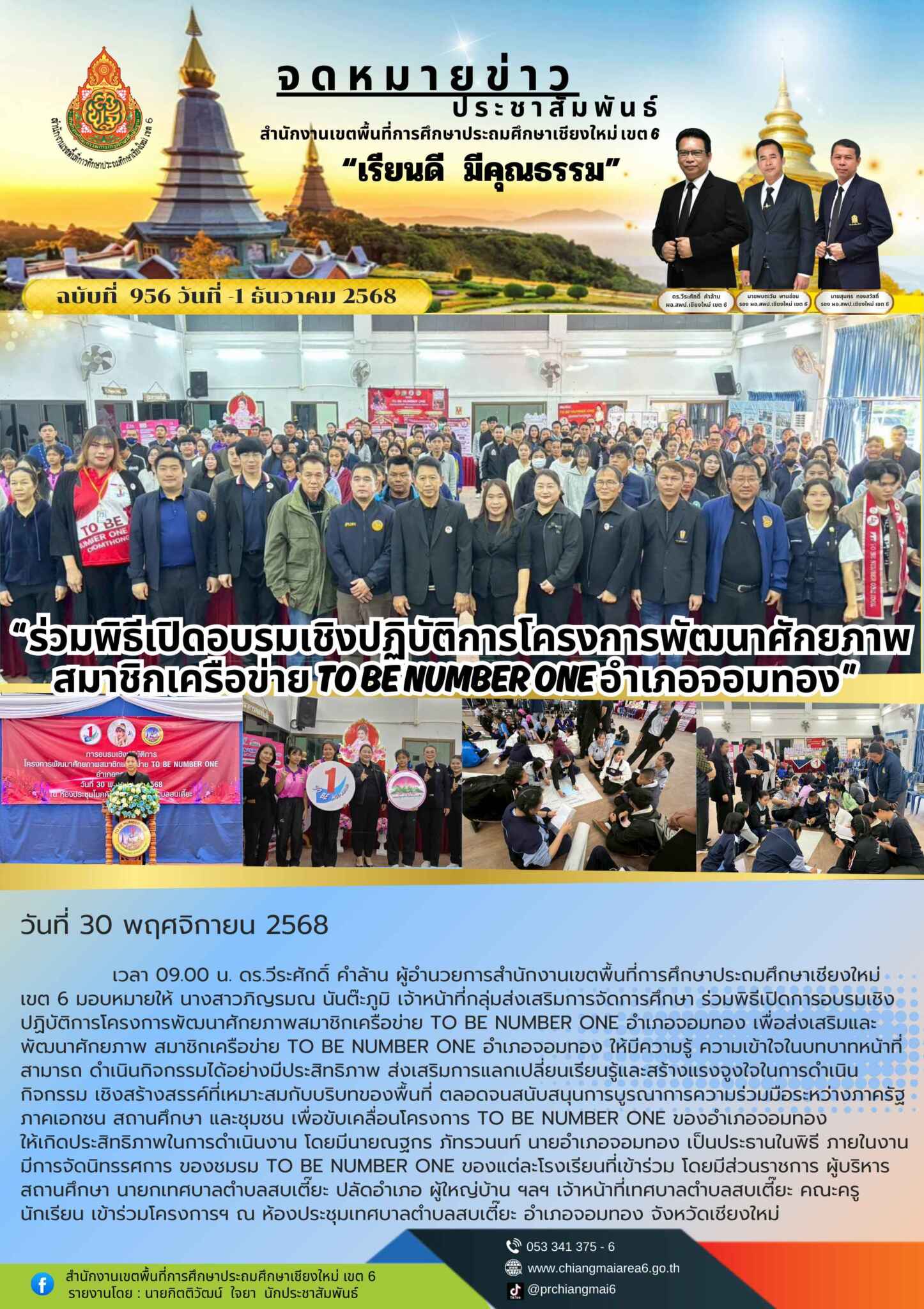 วันที่ 30 พฤศจิกายน 2568 เวลา 09.00 น. ดร.วีระศักดิ์ คำล้าน ผู้อำนวยการสำนักงานเขตพื้นที่การศึกษาประถมศึกษาเชียงใหม่ เขต 6 มอบหมายให้ นางสาวภิญรมณ นันต๊ะภูมิ เจ้าหน้าที่กลุ่มส่งเสริมการจัดการศึกษา ร่วมพิธีเปิดการอบรมเชิงปฏิบัติการโครงการพัฒนาศักยภาพสมาชิกเครือข่าย TO BE NUMBER ONE อำเภอจอมทอง เพื่อส่งเสริมและพัฒนาศักยภาพ สมาชิกเครือข่าย TO BE NUMBER ONE อำเภอจอมทอง ให้มีความรู้ ความเข้าใจในบทบาทหน้าที่สามารถ ดำเนินกิจกรรมได้อย่างมีประสิทธิภาพ ส่งเสริมการแลกเปลี่ยนเรียนรู้และสร้างแรงจูงใจในการดำเนินกิจกรรม เชิงสร้างสรรค์ที่เหมาะสมกับบริบทของพื้นที่ ตลอดจนสนับสนุนการบูรณาการความร่วมมือระหว่างภาครัฐ ภาคเอกชน สถานศึกษา และชุมชน เพื่อขับเคลื่อนโครงการ TO BE NUMBER ONE ของอำเภอจอมทอง ให้เกิดประสิทธิภาพในการดำเนินงาน โดยมีนายณฐกร ภัทรวนนท์ นายอำเภอจอมทอง เป็นประธานในพิธี ภายในงานมีการจัดนิทรรศการ ของชมรม TO BE NUMBER ONE ของแต่ละโรงเรียนที่เข้าร่วม โดยมีส่วนราชการ ผู้บริหารสถานศึกษา นายกเทศบาลตำบลสบเตี๊ยะ ปลัดอำเภอ ผู้ใหญ่บ้าน ฯลฯ เจ้าหน้าที่เทศบาลตำบลสบเตี๊ยะ คณะครู นักเรียน เข้าร่วมโครงการฯ ณ ห้องประชุมเทศบาลตำบลสบเตี๊ยะ อำเภอจอมทอง จังหวัดเชียงใหม่