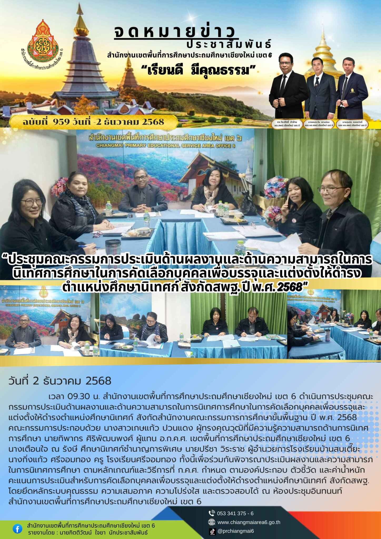 วันที่ 2 ธันวาคม 2568 เวลา 09.30 น. สำนักงานเขตพื้นที่การศึกษาประถมศึกษาเชียงใหม่ เขต 6 ดำเนินการประชุมคณะกรรมการประเมินด้านผลงานและด้านความสามารถในการนิเทศการศึกษาในการคัดเลือกบุคคลเพื่อบรรจุและแต่งตั้งให้ดำรงตำแหน่งศึกษานิเทศก์ สังกัดสำนักงานคณะกรรมการการศึกษาขั้นพื้นฐาน ปี พ.ศ. 2568 คณะกรรมการประกอบด้วย นางสาวเกษแก้ว ปวนแดง ผู้ทรงคุณวุฒิที่มีความรู้ความสามารถด้านการนิเทศการศึกษา นายทิพากร ศิริพัฒนพงศ์ ผู้แทน อ.ก.ค.ศ. เขตพื้นที่การศึกษาประถมศึกษาเชียงใหม่ เขต 6 นางเตือนใจ ณ รังษี ศึกษานิเทศก์ชำนาญการพิเศษ นายปรีชา วิระราช ผู้อำนวยการโรงเรียนบ้านสบเตี๊ยะ นางกิ่งแก้ว ศรีจอมทอง ครู โรงเรียนศรีจอมทอง ทั้งนี้เพื่อร่วมกันพิจารณาประเมินผลงานและความสามารภในการนิเทศการศึกษา ตามหลักเกณฑ์และวิธีการที่ ก.ค.ศ. กำหนด ตามองค์ประกอบ ตัวชี้วัด และค่าน้ำหนักคะแนนการประเมินสำหรับการคัดเลือกบุคคลเพื่อบรรจุและแต่งตั้งให้ดำรงตำแหน่งศึกษานิเทศก์ สังกัดสพฐ. โดยยึดหลักระบบคุณธรรม ความเสมอภาค ความโปร่งใส และตรวจสอบได้ ณ ห้องประชุมอินทนนท์ สำนักงานเขตพื้นที่การศึกษาประถมศึกษาเชียงใหม่ เขต 6