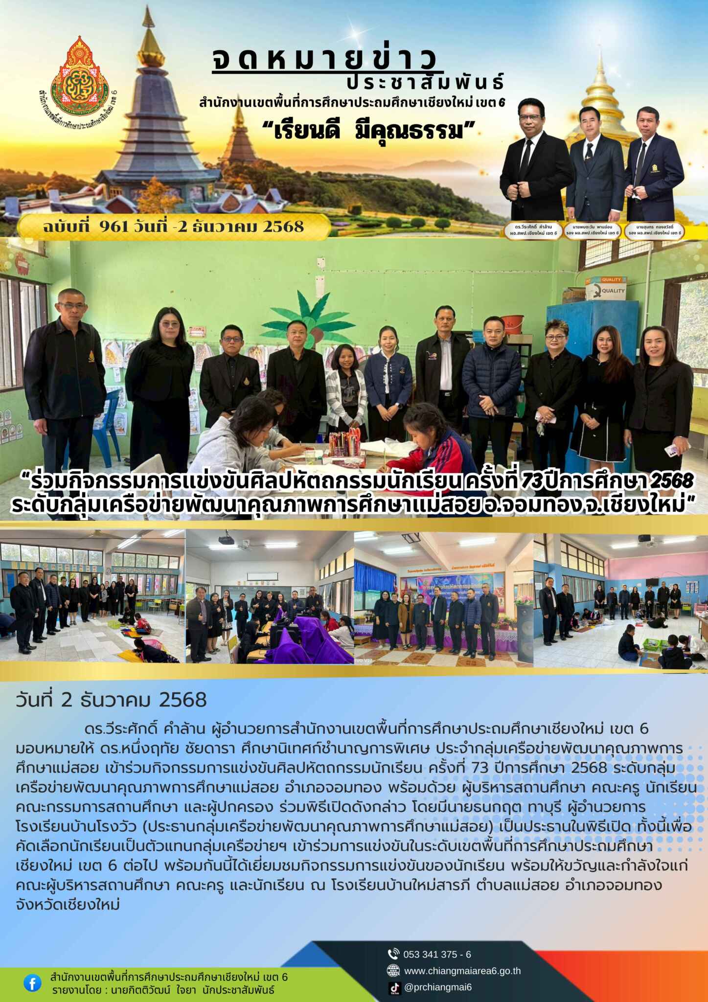 วันที่ 2 ธันวาคม 2568 ดร.วีระศักดิ์ คำล้าน ผู้อำนวยการสำนักงานเขตพื้นที่การศึกษาประถมศึกษาเชียงใหม่ เขต 6 มอบหมายให้ ดร.หนึ่งฤทัย ชัยดารา ศึกษานิเทศก์ชำนาญการพิเศษ ประจำกลุ่มเครือข่ายพัฒนาคุณภาพการศึกษาแม่สอย เข้าร่วมกิจกรรมการแข่งขันศิลปหัตถกรรมนักเรียน ครั้งที่ 73 ปีการศึกษา 2568 ระดับกลุ่มเครือข่ายพัฒนาคุณภาพการศึกษาแม่สอย อำเภอจอมทอง พร้อมด้วย ผู้บริหารสถานศึกษา คณะครู นักเรียน คณะกรรมการสถานศึกษา และผู้ปกครอง ร่วมพิธีเปิดดังกล่าว โดยมีนายธนกฤต ทาบุรี ผู้อำนวยการโรงเรียนบ้านโรงวัว (ประธานกลุ่มเครือข่ายพัฒนาคุณภาพการศึกษาแม่สอย) เป็นประธานในพิธีเปิด ทั้งนี้เพื่อคัดเลือกนักเรียนเป็นตัวแทนกลุ่มเครือข่ายฯ เข้าร่วมการแข่งขันในระดับเขตพื้นที่การศึกษาประถมศึกษาเชียงใหม่ เขต 6 ต่อไป พร้อมกันนี้ได้เยี่ยมชมกิจกรรมการแข่งขันของนักเรียน พร้อมให้ขวัญและกำลังใจแก่คณะผู้บริหารสถานศึกษา คณะครู และนักเรียน ณ โรงเรียนบ้านใหม่สารภี ตำบลแม่สอย อำเภอจอมทอง จังหวัดเชียงให