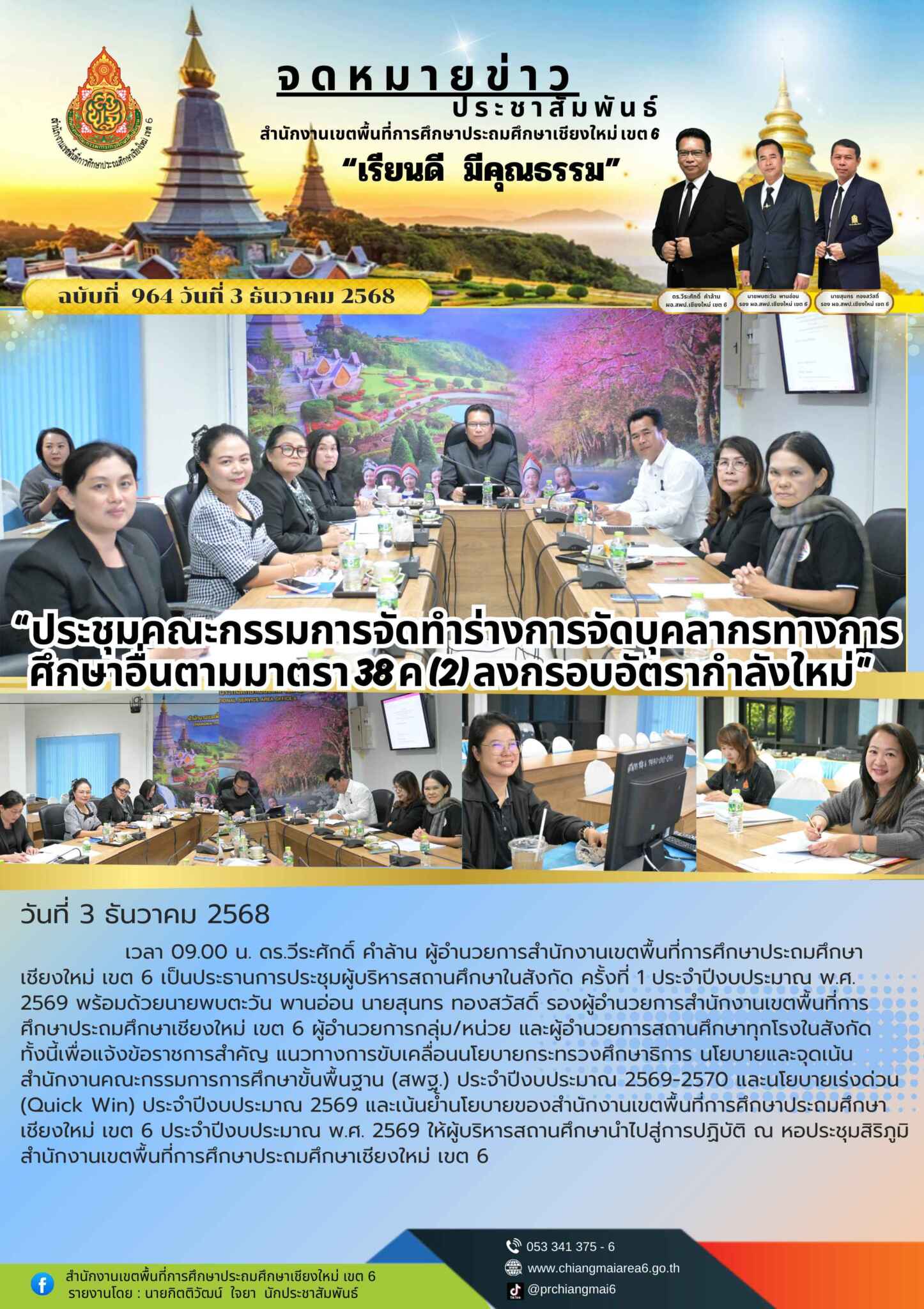 วันที่ 3 ธันวาคม 2568 เวลา 14.00 น. ดร.วีระศักดิ์ คำล้าน ผู้อำนวยการสำนักงานเขตพื้นที่การศึกษาประถมศึกษาเชียงใหม่ เขต 6 เป็นประธานการประชุมคณะกรรมการจัดทำร่างการจัดบุคลากรทางการศึกษาอื่นตามมาตรา 38 ค (2) ลงกรอบอัตรากำลังใหม่ ในสำนักงานเขตพื้นที่การศึกษา/สถานศึกษา พร้อมด้วยนายพบตะวัน พานอ่อน รองผู้อำนวยการสำนักงานเขตพื้นที่การศึกษาประถมศึกษาเชียงใหม่ เขต 6 และคณะกรรมการร่วมประชุมพิจารณาฯ ทั้งนี้เพื่อให้เป็นตามแนวทางการบริหารกรอบอัตรากำลังตามที่ ก.ค.ศ กำหนด ณ ห้องประชุมแม่ยะ สำนักงานเขตพื้นที่การศึกษาประถมศึกษาเชียงใหม่ เขต 6