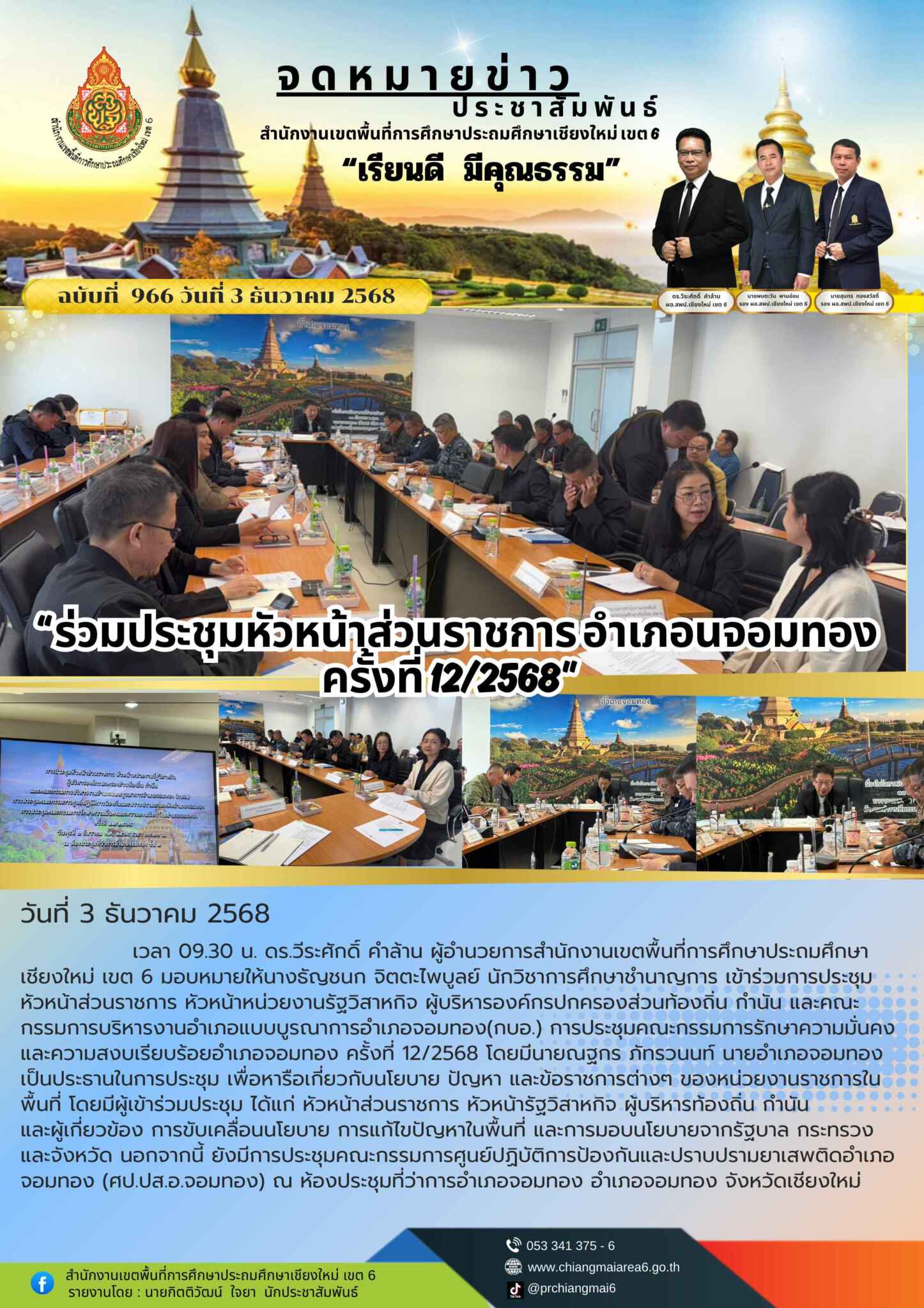 วันที่ 3 ธันวาคม 2568 เวลา 09.30 น. ดร.วีระศักดิ์ คำล้าน ผู้อำนวยการสำนักงานเขตพื้นที่การศึกษาประถมศึกษาเชียงใหม่ เขต 6 มอบหมายให้นางธัญชนก จิตตะไพบูลย์ นักวิชาการศึกษาชำนาญการ เข้าร่วมการประชุมหัวหน้าส่วนราชการ หัวหน้าหน่วยงานรัฐวิสาหกิจ ผู้บริหารองค์กรปกครองส่วนท้องถิ่น กำนัน และคณะกรรมการบริหารงานอำเภอแบบบูรณาการอำเภอจอมทอง(กบอ.) การประชุมคณะกรรมการรักษาความมั่นคงและความสงบเรียบร้อยอำเภอจอมทอง ครั้งที่ 12/2568 โดยมีนายณฐกร ภัทรวนนท์ นายอำเภอจอมทอง เป็นประธานในการประชุม เพื่อหารือเกี่ยวกับนโยบาย ปัญหา และข้อราชการต่างๆ ของหน่วยงานราชการในพื้นที่ โดยมีผู้เข้าร่วมประชุม ได้แก่ หัวหน้าส่วนราชการ หัวหน้ารัฐวิสาหกิจ ผู้บริหารท้องถิ่น กำนัน และผู้เกี่ยวข้อง การขับเคลื่อนนโยบาย การแก้ไขปัญหาในพื้นที่ และการมอบนโยบายจากรัฐบาล กระทรวง และจังหวัด นอกจากนี้ ยังมีการประชุมคณะกรรมการศูนย์ปฏิบัติการป้องกันและปราบปรามยาเสพติดอำเภอจอมทอง (ศป.ปส.อ.จอมทอง) ณ ห้องประชุมที่ว่าการอำเภอจอมทอง อำเภอจอมทอง จังหวัดเชียงใหม่