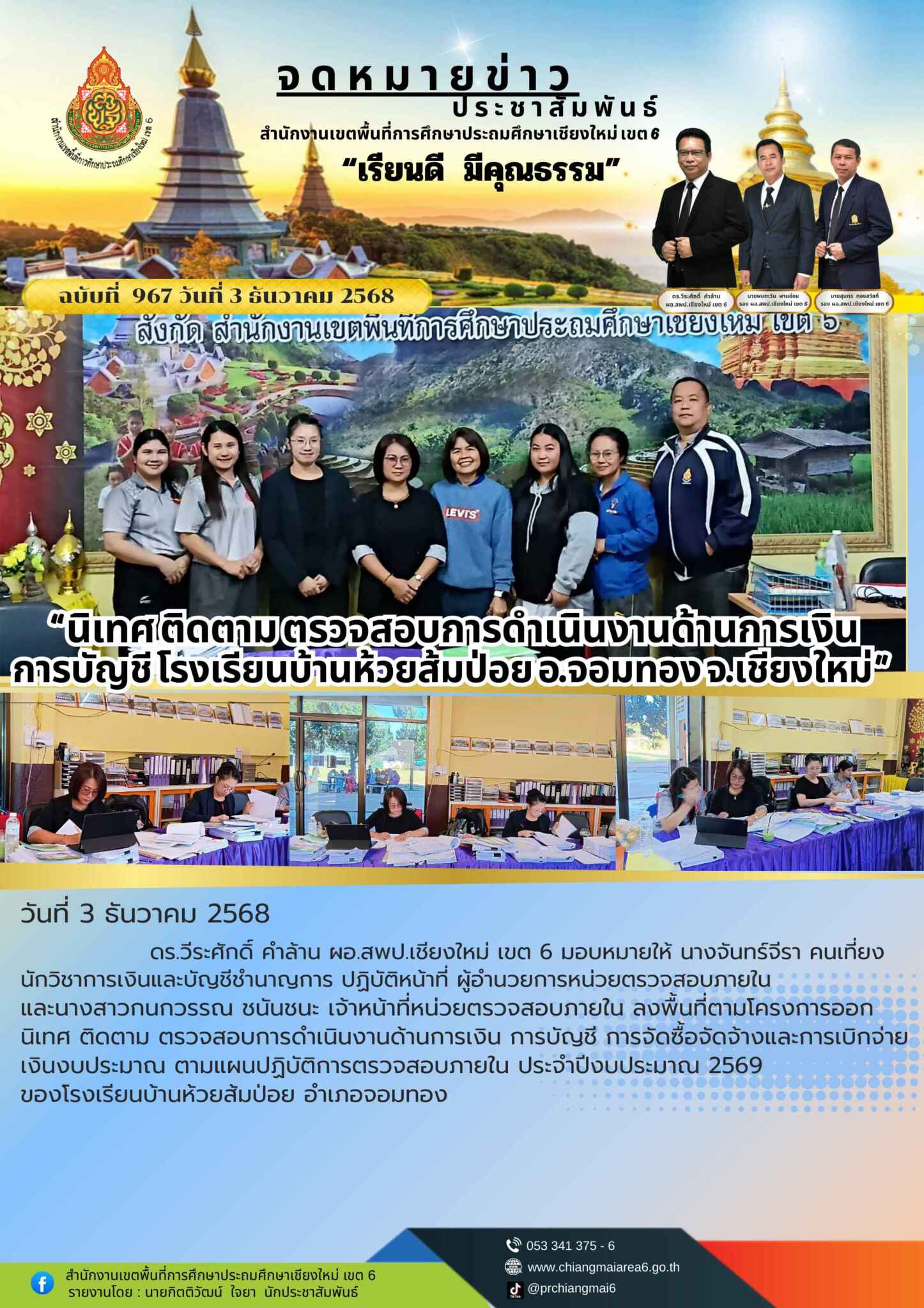 นที่ 3 ธันวาคม 2568 ดร.วีระศักดิ์ คำล้าน ผอ.สพป.เชียงใหม่ เขต 6 มอบหมายให้ นางจันทร์จีรา คนเที่ยง นักวิชาการเงินและบัญชีชำนาญการ ปฏิบัติหน้าที่ ผู้อำนวยการหน่วยตรวจสอบภายใน และ นางสาวกนกวรรณ ชนันชนะ เจ้าหน้าที่หน่วยตรวจสอบภายใน ลงพื้นที่ตามโครงการออกนิเทศ ติดตาม ตรวจสอบการดำเนินงานด้านการเงิน การบัญชี การจัดซื้อจัดจ้างและการเบิกจ่ายเงินงบประมาณ ตามแผนปฏิบัติการตรวจสอบภายใน ประจำปีงบประมาณ 2569 ของโรงเรียนบ้านห้วยส้มป่อย อำเภอจอมทอง