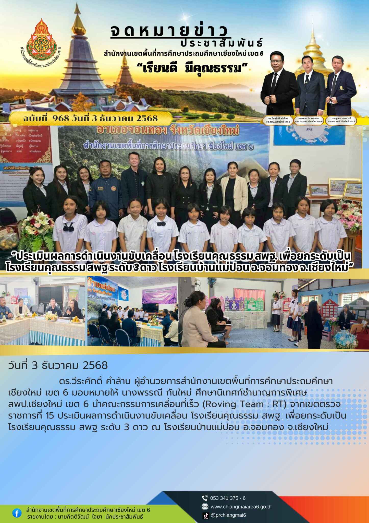 วันที่ 3 ธันวาคม 2568 ดร.วีระศักดิ์ คำล้าน ผู้อำนวยการสำนักงานเขตพื้นที่การศึกษาประถมศึกษาเชียงใหม่ เขต 6 มอบหมายให้ นางพรรณี กันใหม่ ศึกษานิเทศก์ชำนาญการพิเศษ สพป.เชียงใหม่ เขต 6 นำคณะกรรมการเคลื่อนที่เร็ว (Roving Team : RT) จากเขตตรวจราชการที่ 15 ประเมินผลการดำเนินงานขับเคลื่อน โรงเรียนคุณธรรม สพฐ. เพื่อยกระดับเป็น โรงเรียนคุณธรรม สพฐ ระดับ 3 ดาว ณ โรงเรียนบ้านแม่ปอน อ.จอมทอง จ.เชียงใหม่