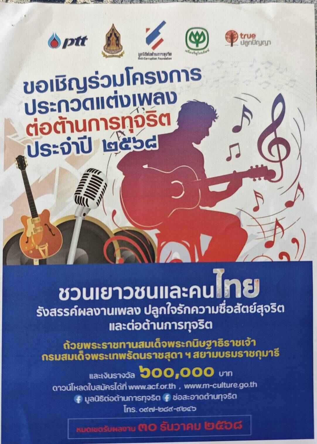 ด้วยมูลนิธิต่อต้านการทุจริต ร่วมกับกระทรวงวัฒนธรรม เครือเจริญโภคภัณฑ์ และทรูปลูกปัญญา ฯ จัดกิจกรรม โครงการประกวอแต่งเพลงต่อตานการทุจริต ประจำปี 2568 รายละเอียดตามเอกสารแนบมาพร้อมนี้49780Download 0