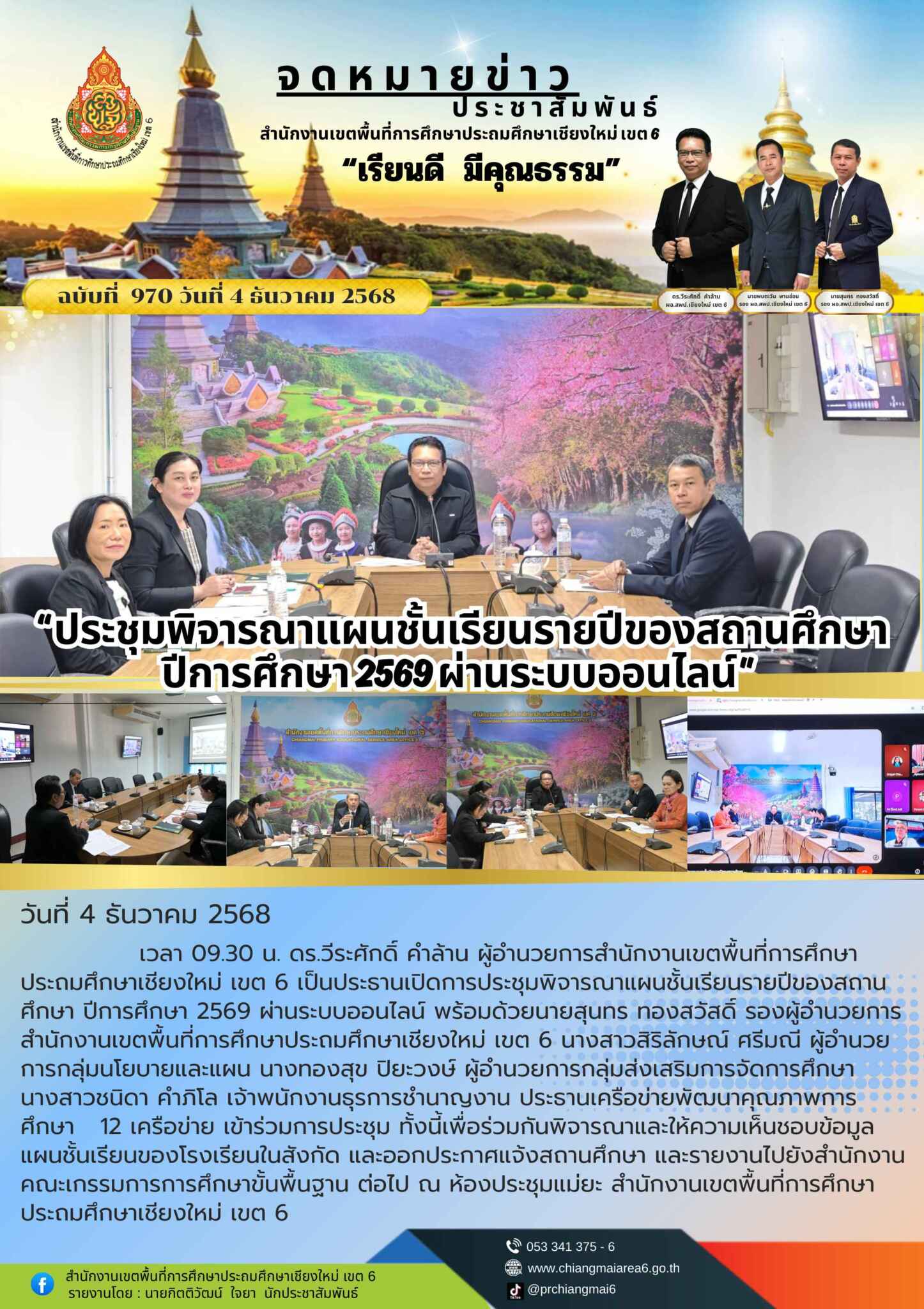 วันที่ 4 ธันวาคม 2568 เวลา 09.30 น. ดร.วีระศักดิ์ คำล้าน ผู้อำนวยการสำนักงานเขตพื้นที่การศึกษาประถมศึกษาเชียงใหม่ เขต 6 เป็นประธานเปิดการประชุมพิจารณาแผนชั้นเรียนรายปีของสถานศึกษา ปีการศึกษา 2569 ผ่านระบบออนไลน์ พร้อมด้วยนายสุนทร ทองสวัสดิ์ รองผู้อำนวยการสำนักงานเขตพื้นที่การศึกษาประถมศึกษาเชียงใหม่ เขต 6 นางสาวสิริลักษณ์ ศรีมณี ผู้อำนวยการกลุ่มนโยบายและแผน นางทองสุข ปิยะวงษ์ ผู้อำนวยการกลุ่มส่งเสริมการจัดการศึกษา นางสาวชนิดา คำภิโล เจ้าพนักงานธุรการชำนาญงาน ประธานเครือข่ายพัฒนาคุณภาพการศึกษา 12 เครือข่าย เข้าร่วมการประชุม ทั้งนี้เพื่อร่วมกันพิจารณาและให้ความเห็นชอบข้อมูลแผนชั้นเรียนของโรงเรียนในสังกัด และออกประกาศแจ้งสถานศึกษา และรายงานไปยังสำนักงานคณะเกรรมการการศึกษาขั้นพื้นฐาน ต่อไป ณ ห้องประชุมแม่ยะ สำนักงานเขตพื้นที่การศึกษาประถมศึกษาเชียงใหม่ เขต 6