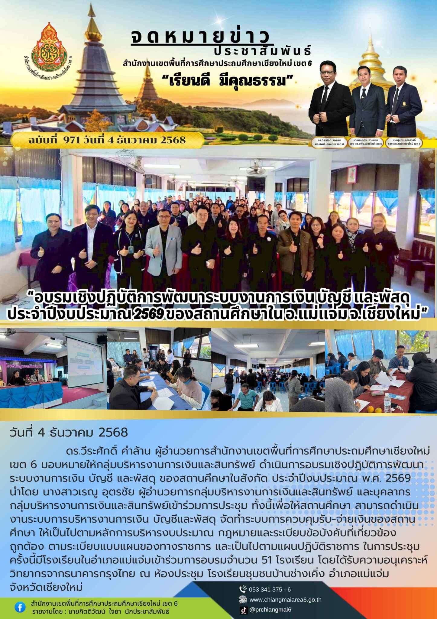 วันที่ 4 ธันวาคม 2568 เวลา 09.00 น ดร.วีระศักดิ์ คำล้าน ผู้อำนวยการสำนักงานเขตพื้นที่การศึกษาประถมศึกษาเชียงใหม่ เขต 6 มอบหมายให้กลุ่มบริหารงานการเงินและสินทรัพย์ ดำเนินการอบรมเชิงปฏิบัติการพัฒนาระบบงานการเงิน บัญชี และพัสดุ ของสถานศึกษาในสังกัด ประจำปีงบประมาณ พ.ศ. 2569 นำโดย นางสาวเรณู อุตรชัย ผู้อำนวยการกลุ่มบริหารงานการเงินและสินทรัพย์ และบุคลากรกลุ่มบริหารงานการเงินและสินทรัพย์เข้าร่วมการประชุม ทั้งนี้เพื่อให้สถานศึกษา สามารถดำเนินงานระบบการบริหารงานการเงิน บัญชีและพัสดุ จัดทำระบบการควบคุมรับ-จ่ายเงินของสถานศึกษา ให้เป็นไปตามหลักการบริหารงบประมาณ กฎหมายและระเบียบข้อบังคับที่เกี่ยวข้อง ถูกต้อง ตามระเบียบแบบแผนของทางราชการ และเป็นไปตามแผนปฏิบัติราชการ ในการประชุมครั้งนี้มีโรงเรียนในอำเภอแม่แจ่มเข้าร่วมการอบรมจำนวน 51 โรงเรียน โดยได้รับความอนุเคราะห์วิทยากรจากธนาคารกรุงไทย ณ ห้องประชุม โรงเรียนชุมชนบ้านช่างเคิ่ง อำเภอแม่แจ่ม จังหวัดเชียงใหม่