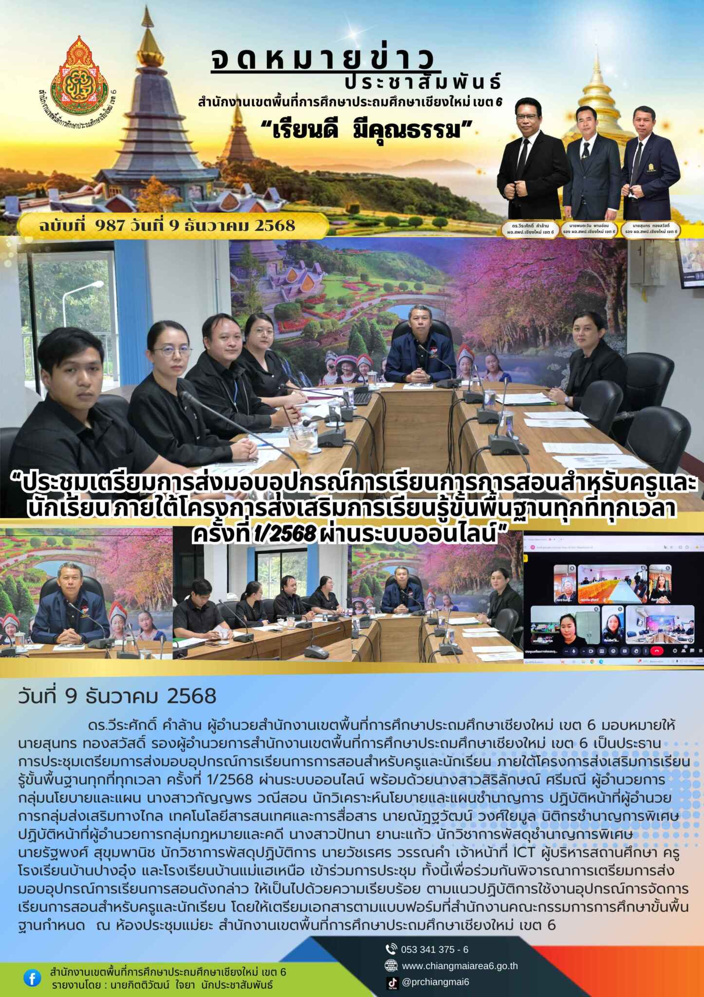 วันที่ 9 ธันวาคม 2568 ดร.วีระศักดิ์ คำล้าน ผู้อำนวยสำนักงานเขตพื้นที่การศึกษาประถมศึกษาเชียงใหม่ เขต 6 มอบหมายให้นายสุนทร ทองสวัสดิ์ รองผู้อำนวยการสำนักงานเขตพื้นที่การศึกษาประถมศึกษาเชียงใหม่ เขต 6 เป็นประธานการประชุมเตรียมการส่งมอบอุปกรณ์การเรียนการการสอนสำหรับครูและนักเรียน ภายใต้โครงการส่งเสริมการเรียนรู้ขั้นพื้นฐานทุกที่ทุกเวลา ครั้งที่ 1/2568 ผ่านระบบออนไลน์ พร้อมด้วยนางสาวสิริลักษณ์ ศรีมณี ผู้อำนวยการกลุ่มนโยบายและแผน นางสาวกัญญพร วณีสอน นักวิเคราะห์นโยบายและแผนชำนาญการ ปฏิบัติหน้าที่ผู้อำนวยการกลุ่มส่งเสริมทางไกล เทคโนโลยีสารสนเทศและการสื่อสาร นายณัฎฐวัฒน์ วงศ์ใยมูล นิติกรชำนาญการพิเศษ ปฏิบัติหน้าที่ผู้อำนวยการกลุ่มกฎหมายและคดี นางสาวปัทนา ยานะแก้ว นักวิชาการพัสดุชำนาญการพิเศษ นายรัฐพงศ์ สุขุมพานิช นักวิชาการพัสดุปฏิบัติการ นายวัชเรศร วรรณคำ เจ้าหน้าที่ ICT ผู้บริหารสถานศึกษา ครู โรงเรียนบ้านปางอุ๋ง และโรงเรียนบ้านแม่แฮเหนือ เข้าร่วมการประชุม ทั้งนี้เพื่อร่วมกันพิจารณาการเตรียมการส่งมอบอุปกรณ์การเรียนการสอนดังกล่าว ให้เป็นไปด้วยความเรียบร้อย ตามแนวปฏิบัติการใช้งานอุปกรณ์การจัดการเรียนการสอนสำหรับครูและนักเรียน โดยให้เตรียมเอกสารตามแบบฟอร์มที่สำนักงานคณะกรรมการการศึกษาขั้นพื้นฐานกำหนด ณ ห้องประชุมแม่ยะ สำนักงานเขตพื้นที่การศึกษาประถมศึกษาเชียงใหม่ เขต 6