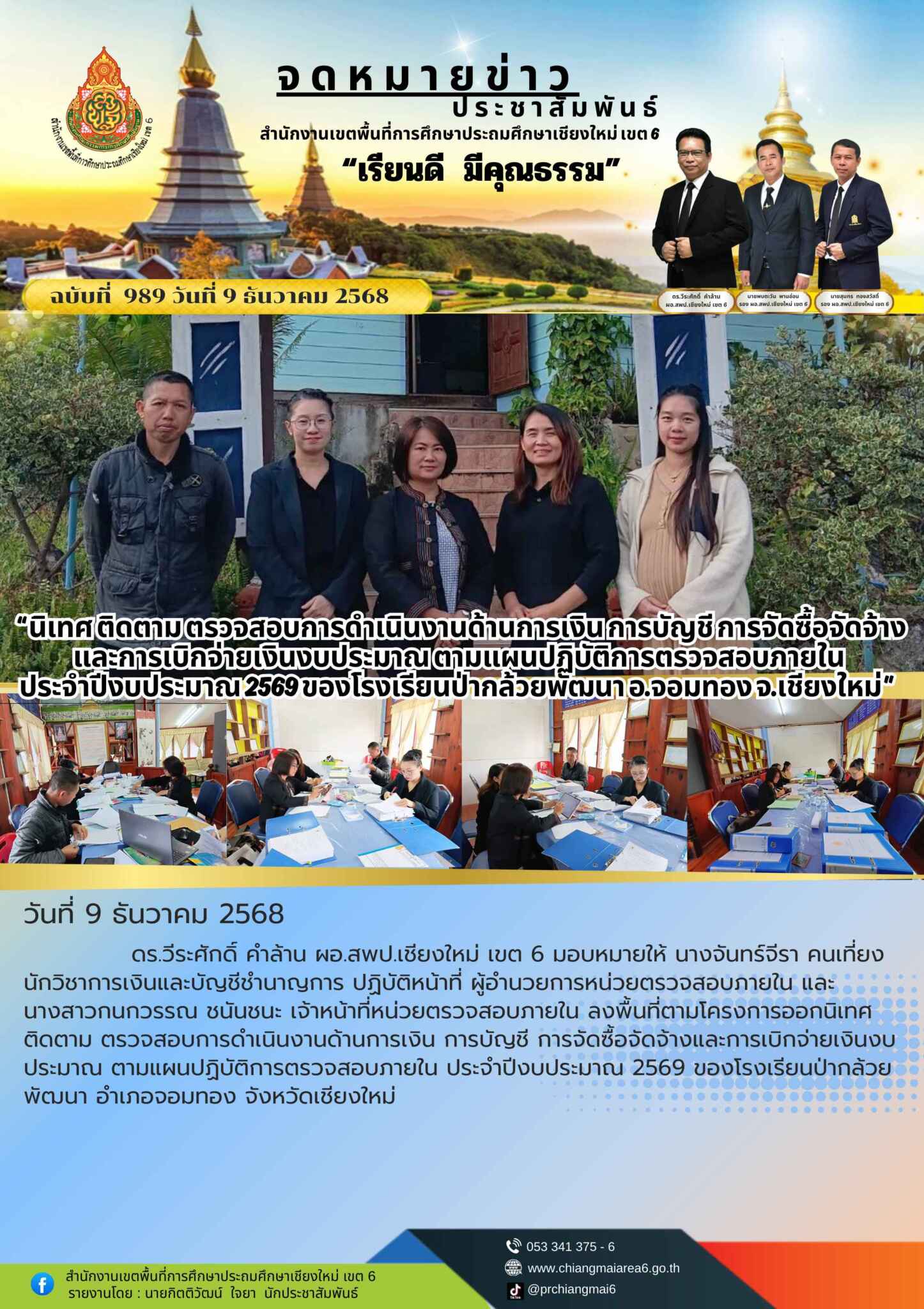 วันที่ 9 ธันวาคม 2568ดร.วีระศักดิ์ คำล้าน ผอ.สพป.เชียงใหม่ เขต 6 มอบหมายให้ นางจันทร์จีรา คนเที่ยง นักวิชาการเงินและบัญชีชำนาญการ ปฏิบัติหน้าที่ ผู้อำนวยการหน่วยตรวจสอบภายใน และ นางสาวกนกวรรณ ชนันชนะ เจ้าหน้าที่หน่วยตรวจสอบภายใน ลงพื้นที่ตามโครงการออกนิเทศ ติดตาม ตรวจสอบการดำเนินงานด้านการเงิน การบัญชี การจัดซื้อจัดจ้างและการเบิกจ่ายเงินงบประมาณ ตามแผนปฏิบัติการตรวจสอบภายใน ประจำปีงบประมาณ 2569 ของโรงเรียนป่ากล้วยพัฒนา อำเภอจอมทอง จังหวัดเชียงใหม่