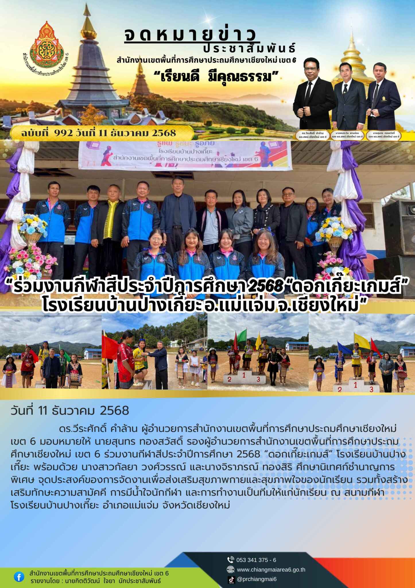 วันที่ 11 ธันวาคม 2568 ดร.วีระศักดิ์ คำล้าน ผู้อำนวยการสำนักงานเขตพื้นที่การศึกษาประถมศึกษาเชียงใหม่ เขต 6 มอบหมายให้ นายสุนทร ทองสวัสดิ์ รองผู้อำนวยการสำนักงานเขตพื้นที่การศึกษาประถมศึกษาเชียงใหม่ เขต 6 ร่วมงานกีฬาสีประจำปีการศึกษา 2568 “ดอกเกี๊ยะเกมส์” โรงเรียนบ้านปางเกี๊ยะ พร้อมด้วย นางสาวกัลยา วงศ์วรรณ์ และนางจิราภรณ์ ทองสิริ ศึกษานิเทศก์ชำนาญการพิเศษ จุดประสงค์ของการจัดงานเพื่อส่งเสริมสุขภาพกายและสุขภาพใจของนักเรียน รวมทั้งสร้างเสริมทักษะความสามัคคี การมีน้ำใจนักกีฬา และการทำงานเป็นทีมให้แก่นักเรียน ณ สนามกีฬา โรงเรียนบ้านปางเกี๊ยะ อำเภอแม่แจ่ม จังหวัดเชียงใหม่