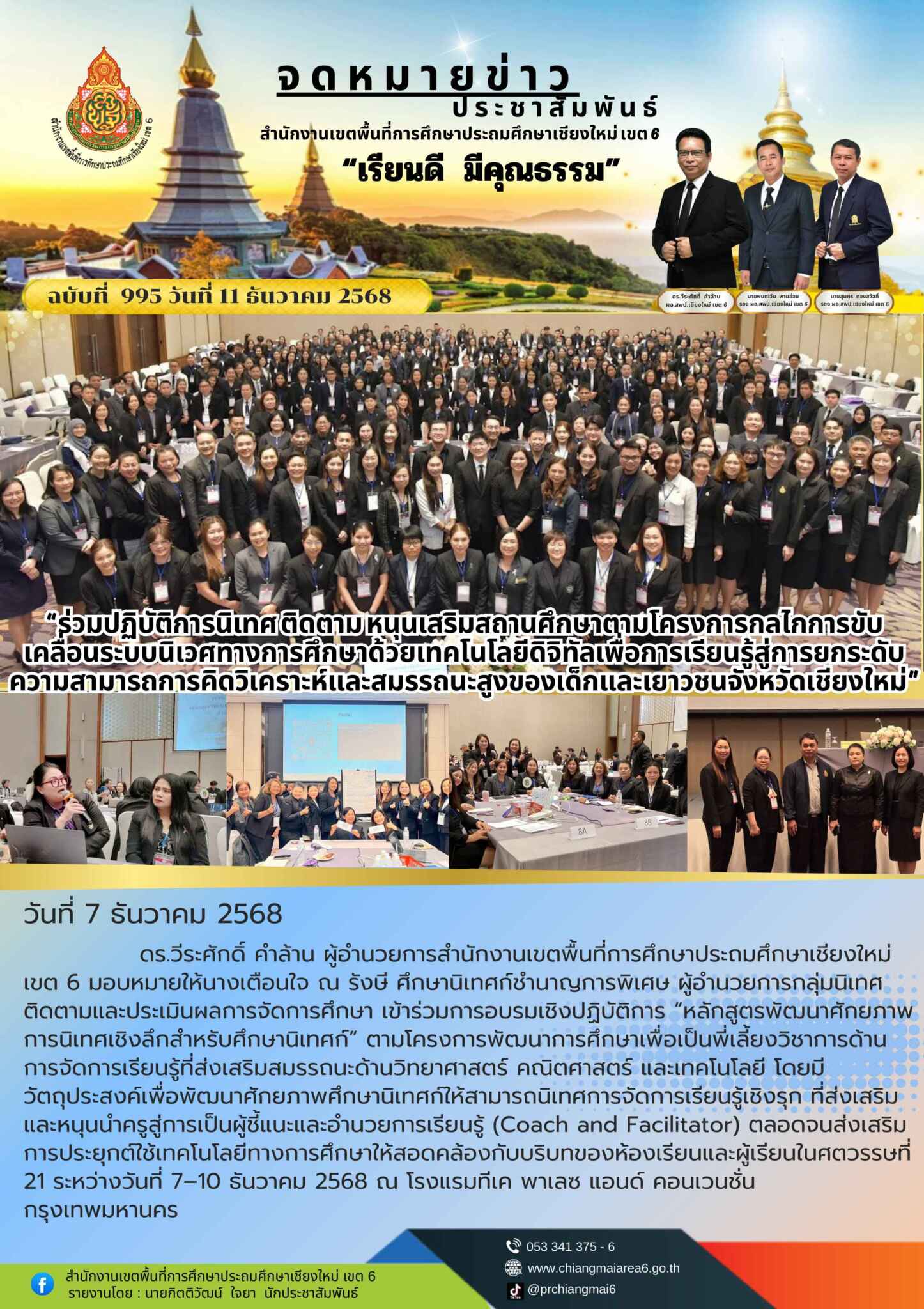 วันที่ 7 ธันวาคม 2568 ดร.วีระศักดิ์ คำล้าน ผู้อำนวยการสำนักงานเขตพื้นที่การศึกษาประถมศึกษาเชียงใหม่ เขต 6 มอบหมายให้นางเตือนใจ ณ รังษี ศึกษานิเทศก์ชำนาญการพิเศษ ผู้อำนวยการกลุ่มนิเทศ ติดตามและประเมินผลการจัดการศึกษา เข้าร่วมการอบรมเชิงปฏิบัติการ “หลักสูตรพัฒนาศักยภาพการนิเทศเชิงลึกสำหรับศึกษานิเทศก์” ตามโครงการพัฒนาการศึกษาเพื่อเป็นพี่เลี้ยงวิชาการด้านการจัดการเรียนรู้ที่ส่งเสริมสมรรถนะด้านวิทยาศาสตร์ คณิตศาสตร์ และเทคโนโลยี โดยมีวัตถุประสงค์เพื่อพัฒนาศักยภาพศึกษานิเทศก์ให้สามารถนิเทศการจัดการเรียนรู้เชิงรุก ที่ส่งเสริมและหนุนนำครูสู่การเป็นผู้ชี้แนะและอำนวยการเรียนรู้ (Coach and Facilitator) ตลอดจนส่งเสริมการประยุกต์ใช้เทคโนโลยีทางการศึกษาให้สอดคล้องกับบริบทของห้องเรียนและผู้เรียนในศตวรรษที่ 21 ระหว่างวันที่ 7–10 ธันวาคม 2568 ณ โรงแรมทีเค พาเลซ แอนด์ คอนเวนชั่น กรุงเทพมหานคร