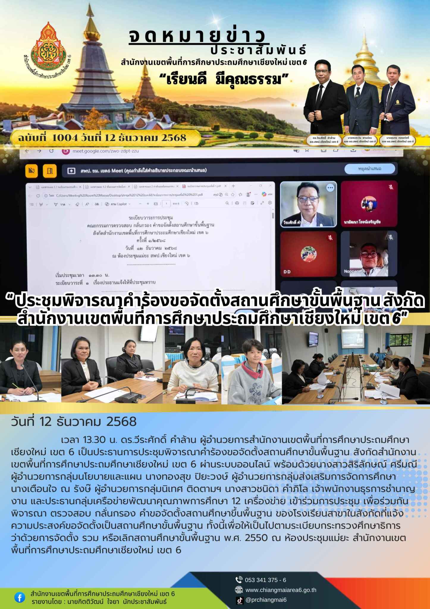 วันที่ 12 ธันวาคม 2568 เวลา 13.30 น. ดร.วีระศักดิ์ คำล้าน ผู้อำนวยการสำนักงานเขตพื้นที่การศึกษาประถมศึกษาเชียงใหม่ เขต 6 เป็นประธานการประชุมพิจารณาคำร้องขอจัดตั้งสถานศึกษาขั้นพื้นฐาน สังกัดสำนักงานเขตพื้นที่การศึกษาประถมศึกษาเชียงใหม่ เขต 6 ผ่านระบบออนไลน์ พร้อมด้วยนางสาวสิริลักษณ์ ศรีมณี ผู้อำนวยการกลุ่มนโยบายและแผน นางทองสุข ปิยะวงษ์ ผู้อำนวยการกลุ่มส่งเสริมการจัดการศึกษา นางเตือนใจ ณ รังษ๊ ผู้อำนวยการกลุ่มนิเทศ ติดตามฯ นางสาวชนิดา คำภิโล เจ้าพนักงานธุรการชำนาญงาน และประธานกลุ่มเครือข่ายพัฒนาคุณภาพการศึกษา 12 เครื่องข่าย เข้าร่วมการประชุม เพื่อร่วมกันพิจารณา ตรวจสอบ กลั่นกรอง คำขอจัดตั้งสถานศึกษาขึ้นพื้นฐาน ของโรงเรียนสาขาในสังกัดที่แจ้งความประสงค์ขอจัดตั้งเป็นสถานศึกษาขั้นพื้นฐาน ทั้งนี้เพื่อให้เป็นไปตามระเบียบกระทรวงศึกษาธิการ ว่าด้วยการจัดตั้ง รวม หรือเลิกสถานศึกษาขั้นพื้นฐาน พ.ศ. 2550 ณ ห้องประชุมแม่ยะ สำนักงานเขตพื้นที่การศึกษาประถมศึกษาเชียงใหม่ เขต 6