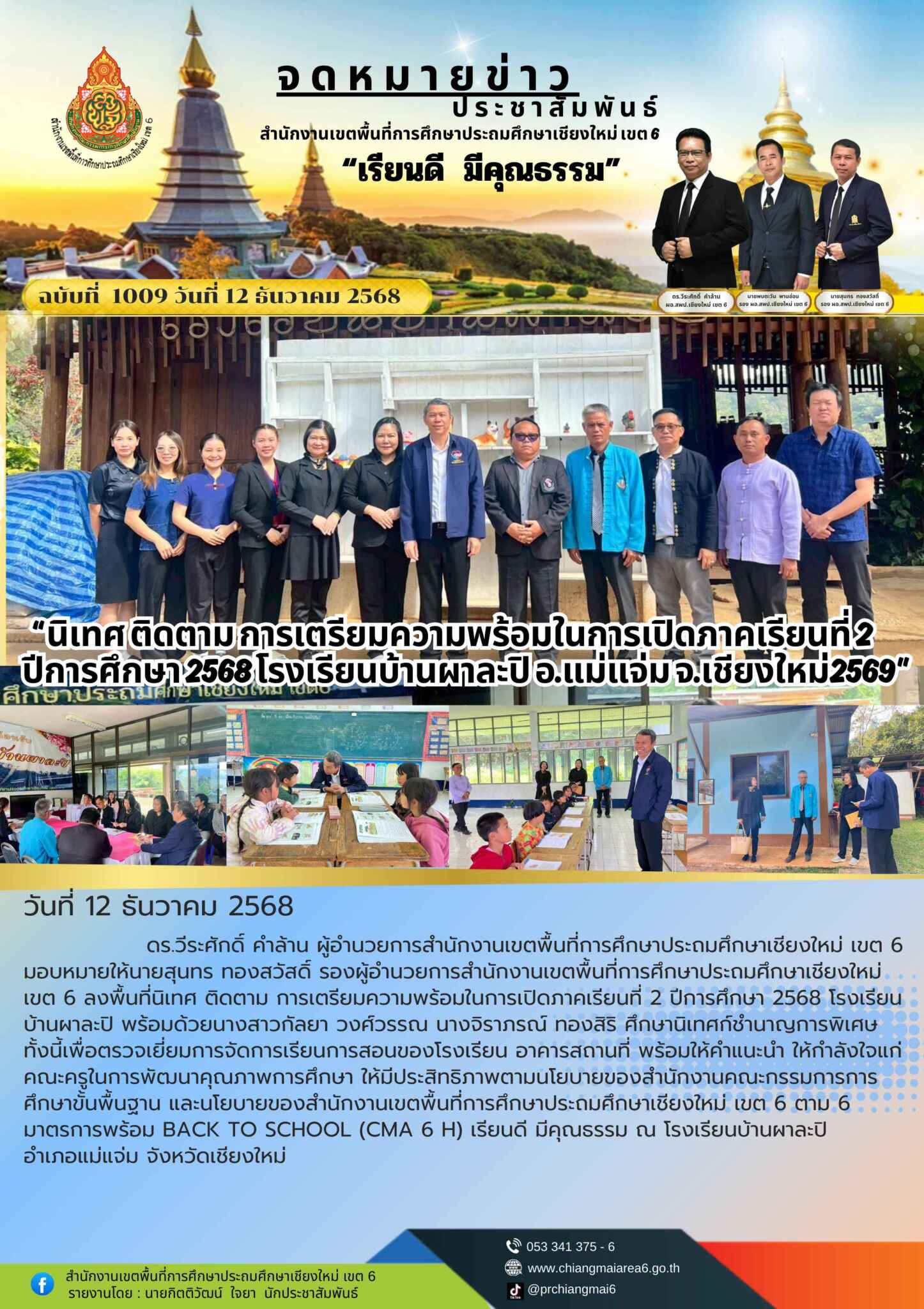 วันที่ 12 ธันวาคม 2568 ดร.วีระศักดิ์ คำล้าน ผู้อำนวยการสำนักงานเขตพื้นที่การศึกษาประถมศึกษาเชียงใหม่ เขต 6 มอบหมายให้นายสุนทร ทองสวัสดิ์ รองผู้อำนวยการสำนักงานเขตพื้นที่การศึกษาประถมศึกษาเชียงใหม่ เขต 6 ลงพื้นที่นิเทศ ติดตาม การเตรียมความพร้อมในการเปิดภาคเรียนที่ 2 ปีการศึกษา 2568 โรงเรียนบ้านผาละปิ พร้อมด้วยนางสาวกัลยา วงศ์วรรณ นางจิราภรณ์ ทองสิริ ศึกษานิเทศก์ชำนาญการพิเศษ ทั้งนี้เพื่อตรวจเยี่ยมการจัดการเรียนการสอนของโรงเรียน อาคารสถานที่ พร้อมให้คำแนะนำ ให้กำลังใจแก่คณะครูในการพัฒนาคุณภาพการศึกษา ให้มีประสิทธิภาพตามนโยบายของสำนักงานคณะกรรมการการศึกษาขั้นพื้นฐาน และนโยบายของสำนักงานเขตพื้นที่การศึกษาประถมศึกษาเชียงใหม่ เขต 6 ตาม 6 มาตรการพร้อม BACK TO SCHOOL (CMA 6 H) เรียนดี มีคุณธรรม ณ โรงเรียนบ้านผาละปิ อำเภอแม่แจ่ม จังหวัดเชียงใหม่