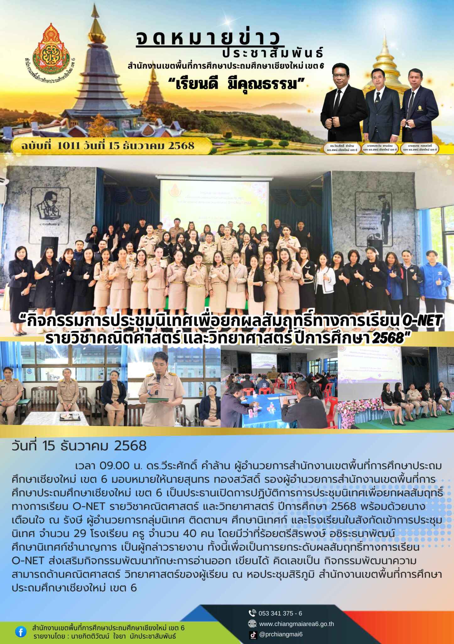 วันที่ 15 ธันวาคม 2568 เวลา 09.00 น. ดร.วีระศักดิ์ คำล้าน ผู้อำนวยการสำนักงานเขตพื้นที่การศึกษาประถมศึกษาเชียงใหม่ เขต 6 มอบหมายให้นายสุนทร ทองสวัสดิ์ รองผู้อำนวยการสำนักงานเขตพื้นที่การศึกษาประถมศึกษาเชียงใหม่ เขต 6 เป็นประธานเปิดการปฏิบัติการการประชุมนิเทศเพื่อยกผลสัมฤทธิ์ทางการเรียน O-NET รายวิชาคณิตศาสตร์ และวิทยาศาสตร์ ปีการศึกษา 2568 พร้อมด้วยนางเตือนใจ ณ รังษี ผู้อำนวยการกลุ่มนิเทศ ติดตามฯ ศึกษานิเทศก์ และโรงเรียนในสังกัดเข้าการประชุมนิเทศ จำนวน 29 โรงเรียน ครู จำนวน 40 คน โดยมีว่าที่ร้อยตรีสิรพงษ์ อชิระธนาพัฒน์ ศึกษานิเทศก์ชำนาญการ เป็นผู้กล่าวรายงาน ทั้งนี้เพื่อเป็นการยกระดับผลสัมฤทธิ์ทางการเรียน O-NET ส่งเสริมกิจกรรมพัฒนาทักษะการอ่านออก เขียนได้ คิดเลขเป็น กิจกรรมพัฒนาความสามารถด้านคณิตศาสตร์ วิทยาศาสตร์ของผู้เรียน ณ หอประชุมสิริภูมิ สำนักงานเขตพื้นที่การศึกษาประถมศึกษาเชียงใหม่ เขต 6