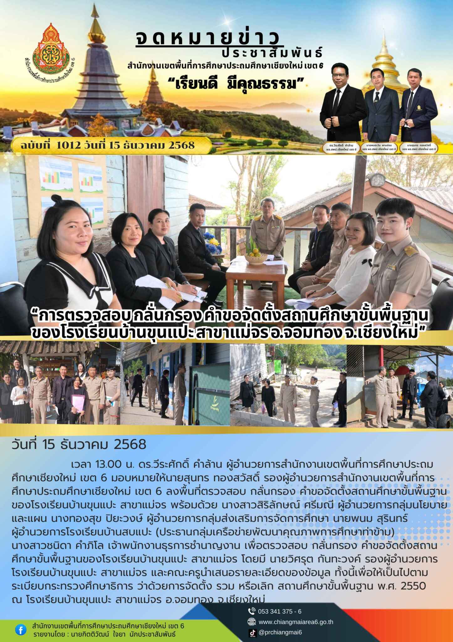วันที่ 15 ธันวาคม 2568 เวลา 13.00 น. ดร.วีระศักดิ์ คำล้าน ผู้อำนวยการสำนักงานเขตพื้นที่การศึกษาประถมศึกษาเชียงใหม่ เขต 6 มอบหมายให้นายสุนทร ทองสวัสดิ์ รองผู้อำนวยการสำนักงานเขตพื้นที่การศึกษาประถมศึกษาเชียงใหม่ เขต 6 ลงพื้นที่ตรวจสอบ กลั่นกรอง คำขอจัดตั้งสถานศึกษาขั้นพื้นฐาน ของโรงเรียนบ้านขุนแปะ สาขาแม่จร พร้อมด้วย นางสาวสิริลักษณ์ ศรีมณี ผู้อำนวยการกลุ่มนโยบายและแผน นางทองสุข ปิยะวงษ์ ผู้อำนวยการกลุ่มส่งเสริมการจัดการศึกษา นายพนม สุรินทร์ ผู้อำนวยการโรงเรียนบ้านสบแปะ (ประธานกลุ่มเครือข่ายพัฒนาคุณภาพการศึกษาท่าข้าม) นางสาวชนิดา คำภิโล เจ้าพนักงานธุรการชำนาญงาน เพื่อตรวจสอบ กลั่นกรอง คำขอจัดตั้งสถานศึกษาขั้นพื้นฐานของโรงเรียนบ้านขุนแปะ สาขาแม่จร โดยมี นายวิศรุต กันทะวงค์ รองผู้อำนวยการโรงเรียนบ้านขุนแปะ สาขาแม่จร และคณะครูนำเสนอรายละเอียดของข้อมูล ทั้งนี้เพื่อให้เป็นไปตามระเบียบกระทรวงศึกษาธิการ ว่าด้วยการจัดตั้ง รวม หรือเลิก สถานศึกษาขั้นพื้นฐาน พ.ศ. 2550 ณ โรงเรียนบ้านขุนแปะ สาขาแม่จร อ.จอมทอง จ.เชียงใหม่