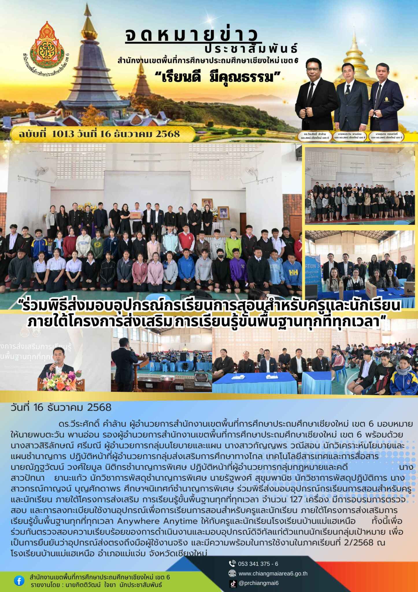 วันที่ 16 ธันวาคม 2568 ดร.วีระศักดิ์ คำล้าน ผู้อำนวยการสำนักงานเขตพื้นที่การศึกษาประถมศึกษาเชียงใหม่ เขต 6 มอบหมายให้นายพบตะวัน พานอ่อน รองผู้อำนวยการสำนักงานเขตพื้นที่การศึกษาประถมศึกษาเชียงใหม่ เขต 6 พร้อมด้วยนางสาวสิริลักษณ์ ศรีมณี ผู้อำนวยการกลุ่มนโยบายและแผน นางสาวกัญญพร วณีสอน นักวิเคราะห์นโยบายและแผนชำนาญการ ปฏิบัติหน้าที่ผู้อำนวยการกลุ่มส่งเสริมการศึกษาทางไกล เทคโนโลยีสารเทศและการสื่อสาร นายณัฎฐวัฒน์ วงศ์ใยมูล นิติกรชำนาญการพิเศษ ปฏิบัติหน้าที่ผู้อำนวยการกลุ่มกฎหมายและคดี นางสาวปัทนา ยานะแก้ว นักวิชาการพัสดุชำนาญการพิเศษ นายรัฐพงศ์ สุขุมพานิช นักวิชาการพัสดุปฏิบัติการ นางสาวกรณ์กาญจน์ บุญศักดาพร ศึกษาฯนิเทศก์ชำนาญการพิเศษ ร่วมพิธีส่งมอบอุปกรณ์กรเรียนการสอนสำหรับครูและนักเรียน ภายใต้โครงการส่งเสริม การเรียนรู้ขั้นพื้นฐานทุกที่ทุกเวลา จำนวน 127 เครื่อง มีการอบรมการตรวจสอบ และการลงทะเบียนใช้งานอุปกรณ์เพื่อการเรียนการสอนสำหรับครูและนักเรียน ภายใต้โครงการส่งเสริมการเรียนรู้ขั้นพื้นฐานทุกที่ทุกเวลา Anywhere Anytime ให้กับครูและนักเรียนโรงเรียนบ้านแม่แฮเหนือ ทั้งนี้เพื่อร่วมกันตรวจสอบความเรียบร้อยของการดำเนินงานและมอบอุปกรณ์ดิจิทัลแก่ตัวแทนนักเรียนกลุ่มเป้าหมาย เพื่อเป็นการยืนยันว่าอุปกรณ์ส่งตรงถึงมือผู้ใช้งานจริง และมีความพร้อมในการใช้งานในภาคเรียนที่ 2/2568 ณ โรงเรียนบ้านแม่แฮเหนือ อำเภอแม่แจ่ม จังหวัดเชียงใหม่