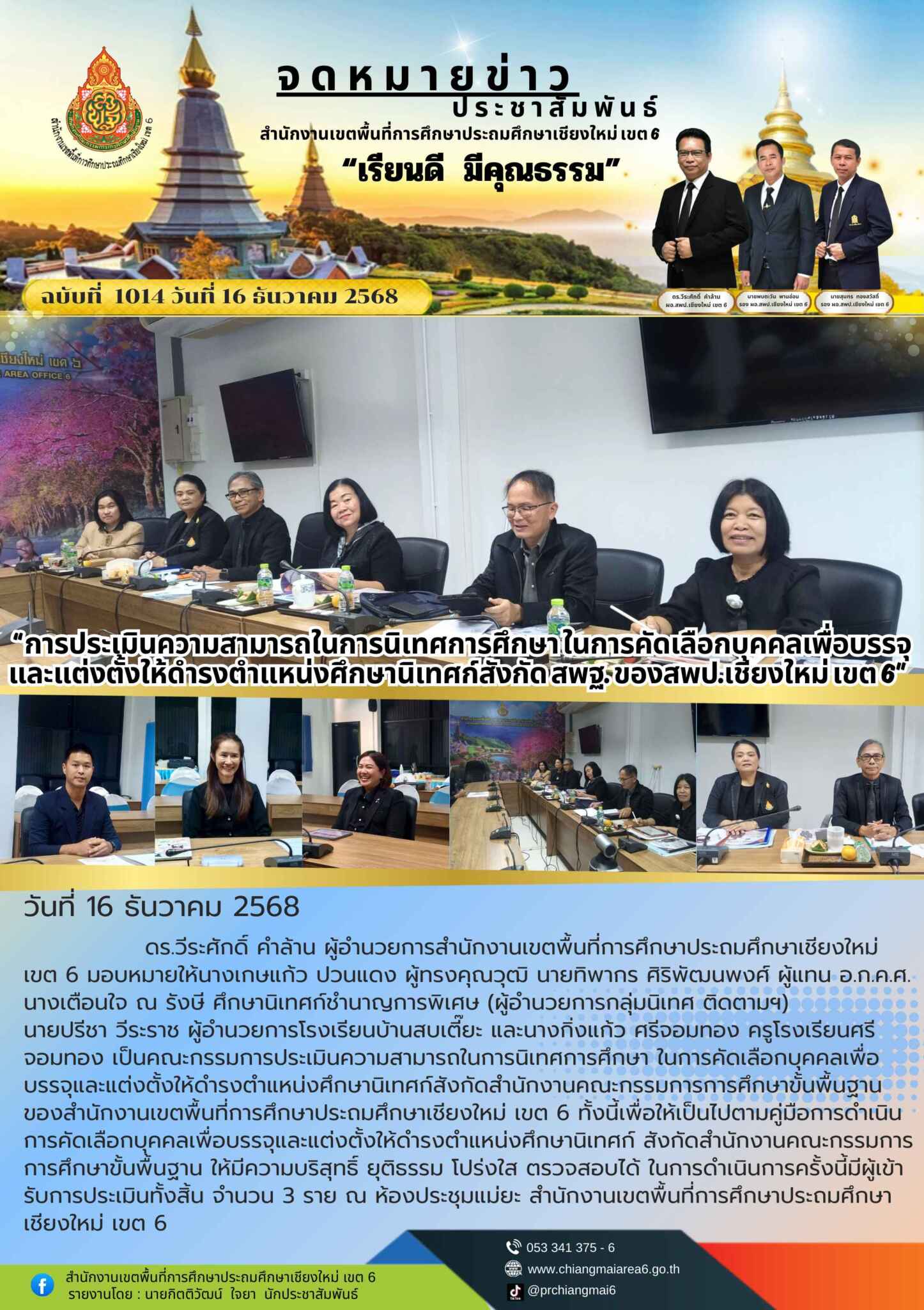 วันที่ 16 ธันวาคม 2568 ดร.วีระศักดิ์ คำล้าน ผู้อำนวยการสำนักงานเขตพื้นที่การศึกษาประถมศึกษาเชียงใหม่ เขต 6 มอบหมายให้นางเกษแก้ว ปวนแดง ผู้ทรงคุณวุฒิ นายทิพากร ศิริพัฒนพงศ์ ผู้แทน อ.ก.ค.ศ. นางเตือนใจ ณ รังษี ศึกษานิเทศก์ชำนาญการพิเศษ (ผู้อำนวยการกลุ่มนิเทศ ติดตามฯ) นายปรีชา วีระราช ผู้อำนวยการโรงเรียนบ้านสบเตี๊ยะ และนางกิ่งแก้ว ศรีจอมทอง ครูโรงเรียนศรีจอมทอง เป็นคณะกรรมการประเมินความสามารถในการนิเทศการศึกษา ในการคัดเลือกบุคคลเพื่อบรรจุและแต่งตั้งให้ดำรงตำแหน่งศึกษานิเทศก์สังกัดสำนักงานคณะกรรมการการศึกษาขั้นพื้นฐาน ของสำนักงานเขตพื้นที่การศึกษาประถมศึกษาเชียงใหม่ เขต 6 ทั้งนี้เพื่อให้เป็นไปตามคู่มือการดำเนินการคัดเลือกบุคคลเพื่อบรรจุและแต่งตั้งให้ดำรงตำแหน่งศึกษานิเทศก์ สังกัดสำนักงานคณะกรรมการการศึกษาขั้นพื้นฐาน ให้มีความบริสุทธิ์ ยุติธรรม โปร่งใส ตรวจสอบได้ ในการดำเนินการครั้งนี้มีผู้เข้ารับการประเมินทั้งสิ้น จำนวน 3 ราย ณ ห้องประชุมแม่ยะ สำนักงานเขตพื้นที่การศึกษาประถมศึกษาเชียงใหม่ เขต 6