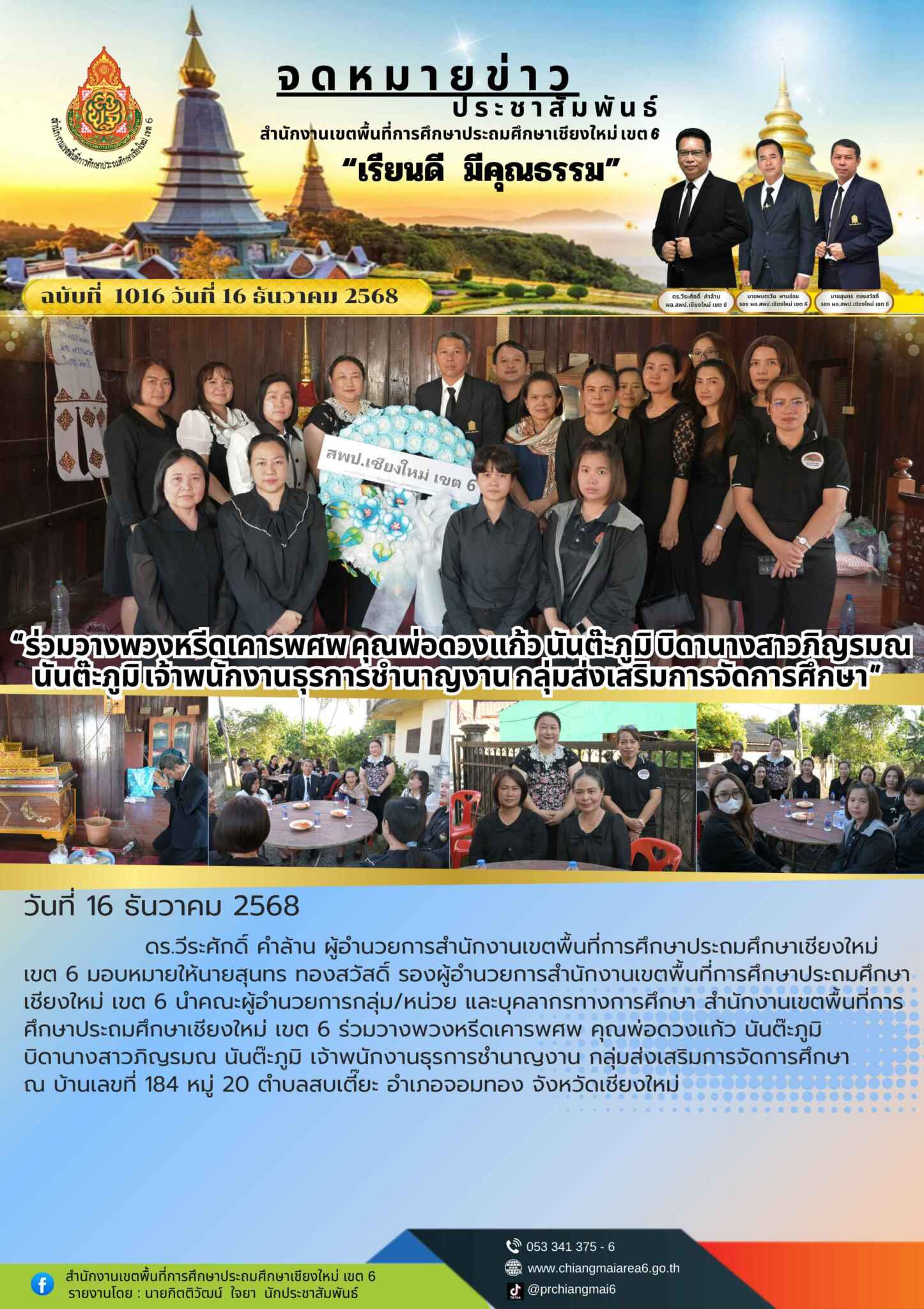 วันที่ 16 ธันวาคม 2568 ดร.วีระศักดิ์ คำล้าน ผู้อำนวยการสำนักงานเขตพื้นที่การศึกษาประถมศึกษาเชียงใหม่ เขต 6 มอบหมายให้นายสุนทร ทองสวัสดิ์ รองผู้อำนวยการสำนักงานเขตพื้นที่การศึกษาประถมศึกษาเชียงใหม่ เขต 6 นำคณะผู้อำนวยการกลุ่ม/หน่วย และบุคลากรทางการศึกษา สำนักงานเขตพื้นที่การศึกษาประถมศึกษาเชียงใหม่ เขต 6 ร่วมวางพวงหรีดเคารพศพ คุณพ่อดวงแก้ว นันต๊ะภูมิ บิดานางสาวภิญรมณ นันต๊ะภูมิ เจ้าพนักงานธุรการชำนาญงาน กลุ่มส่งเสริมการจัดการศึกษา ณ บ้านเลขที่ 184 หมู่ 20 ตำบลสบเตี๊ยะ อำเภอจอมทอง จังหวัดเชียงใหม่