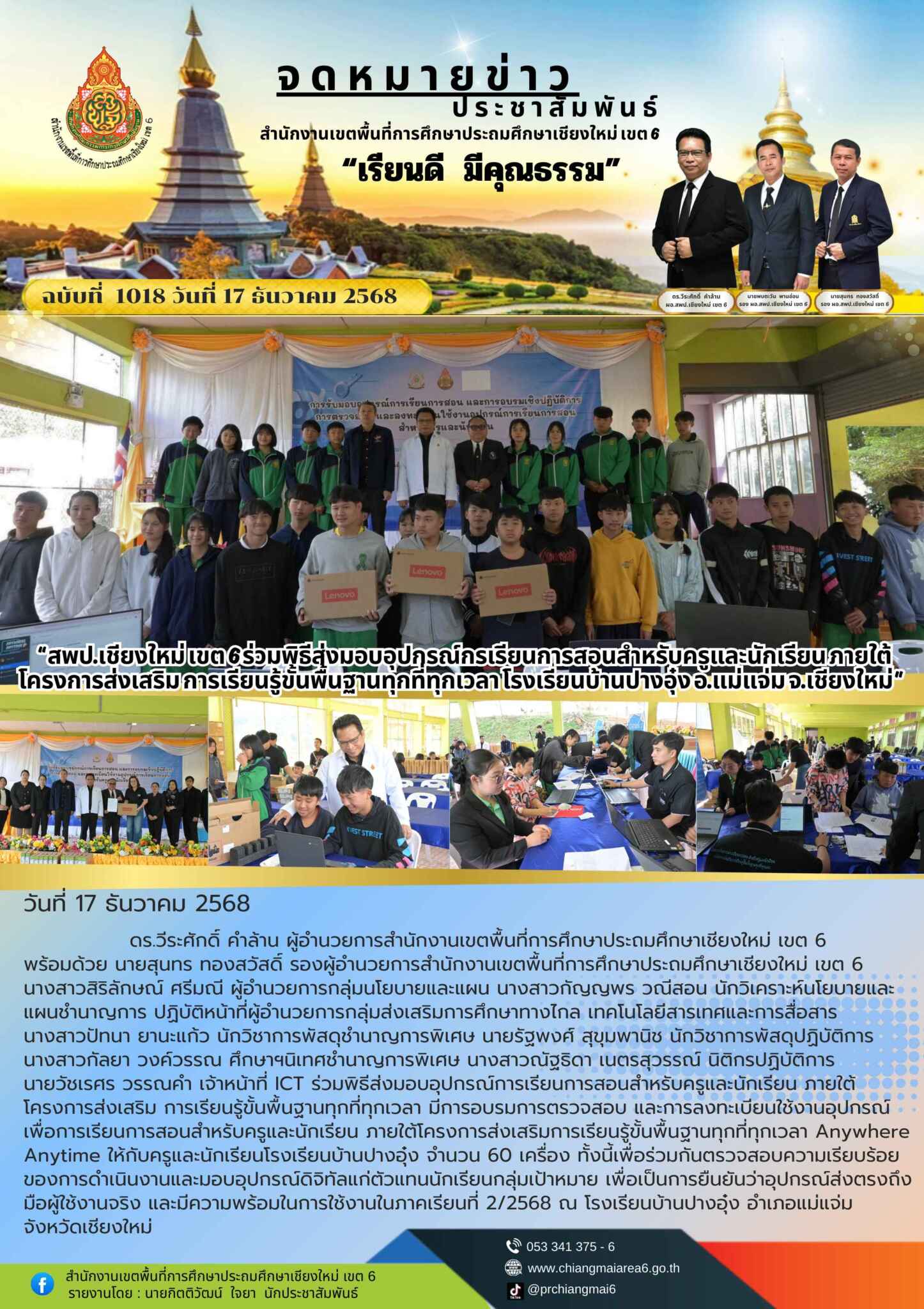 วันที่ 17 ธันวาคม 2568 ดร.วีระศักดิ์ คำล้าน ผู้อำนวยการสำนักงานเขตพื้นที่การศึกษาประถมศึกษาเชียงใหม่ เขต 6 พร้อมด้วย นายสุนทร ทองสวัสดิ์ รองผู้อำนวยการสำนักงานเขตพื้นที่การศึกษาประถมศึกษาเชียงใหม่ เขต 6 นางสาวสิริลักษณ์ ศรีมณี ผู้อำนวยการกลุ่มนโยบายและแผน นางสาวกัญญพร วณีสอน นักวิเคราะห์นโยบายและแผนชำนาญการ ปฏิบัติหน้าที่ผู้อำนวยการกลุ่มส่งเสริมการศึกษาทางไกล เทคโนโลยีสารเทศและการสื่อสาร นางสาวปัทนา ยานะแก้ว นักวิชาการพัสดุชำนาญการพิเศษ นายรัฐพงศ์ สุขุมพานิช นักวิชาการพัสดุปฏิบัติการ นางสาวกัลยา วงค์วรรณ ศึกษาฯนิเทศชำนาญการพิเศษ นางสาวณัฐธิดา เนตรสุวรรณ์ นิติกรปฏิบัติการ นายวัชเรศร วรรณคำ เจ้าหน้าที่ ICT ร่วมพิธีส่งมอบอุปกรณ์การเรียนการสอนสำหรับครูและนักเรียน ภายใต้โครงการส่งเสริม การเรียนรู้ขั้นพื้นฐานทุกที่ทุกเวลา มีการอบรมการตรวจสอบ และการลงทะเบียนใช้งานอุปกรณ์เพื่อการเรียนการสอนสำหรับครูและนักเรียน ภายใต้โครงการส่งเสริมการเรียนรู้ขั้นพื้นฐานทุกที่ทุกเวลา Anywhere Anytime ให้กับครูและนักเรียนโรงเรียนบ้านปางอุ๋ง จำนวน 60 เครื่อง ทั้งนี้เพื่อร่วมกันตรวจสอบความเรียบร้อยของการดำเนินงานและมอบอุปกรณ์ดิจิทัลแก่ตัวแทนนักเรียนกลุ่มเป้าหมาย เพื่อเป็นการยืนยันว่าอุปกรณ์ส่งตรงถึงมือผู้ใช้งานจริง และมีความพร้อมในการใช้งานในภาคเรียนที่ 2/2568 ณ โรงเรียนบ้านปางอุ๋ง อำเภอแม่แจ่ม จังหวัดเชียงใหม่