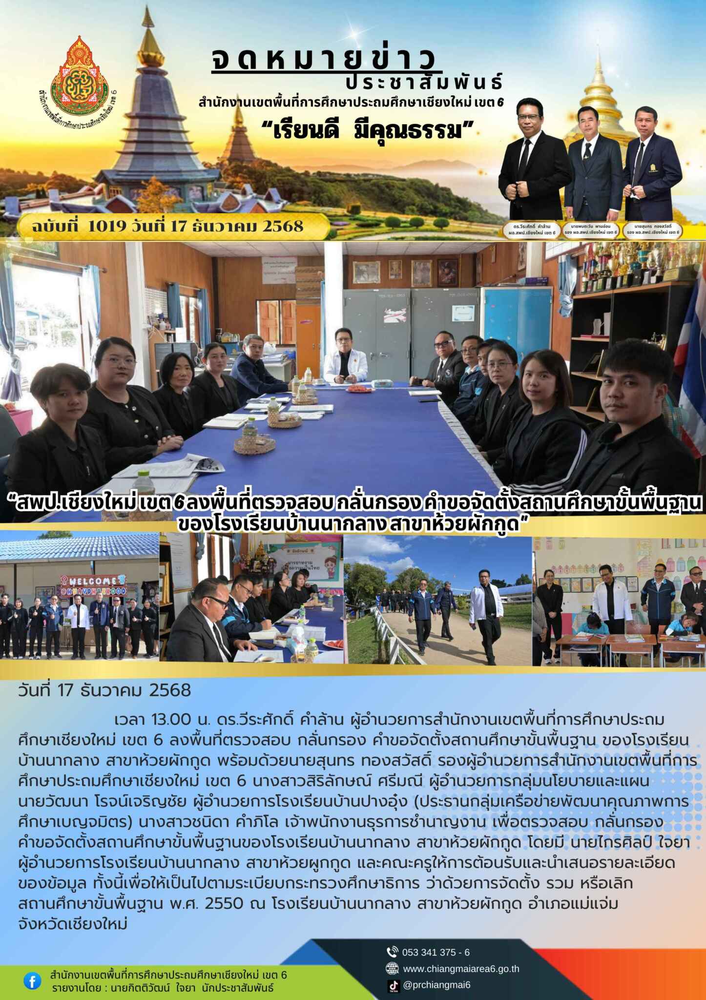 วันที่ 17 ธันวาคม 2568 เวลา 13.00 น. ดร.วีระศักดิ์ คำล้าน ผู้อำนวยการสำนักงานเขตพื้นที่การศึกษาประถมศึกษาเชียงใหม่ เขต 6 ลงพื้นที่ตรวจสอบ กลั่นกรอง คำขอจัดตั้งสถานศึกษาขั้นพื้นฐาน ของโรงเรียนบ้านนากลาง สาขาห้วยผักกูด พร้อมด้วยนายสุนทร ทองสวัสดิ์ รองผู้อำนวยการสำนักงานเขตพื้นที่การศึกษาประถมศึกษาเชียงใหม่ เขต 6 นางสาวสิริลักษณ์ ศรีมณี ผู้อำนวยการกลุ่มนโยบายและแผน นายวัฒนา โรจน์เจริญชัย ผู้อำนวยการโรงเรียนบ้านปางอุ๋ง (ประธานกลุ่มเครือข่ายพัฒนาคุณภาพการศึกษาเบญจมิตร) นางสาวชนิดา คำภิโล เจ้าพนักงานธุรการชำนาญงาน เพื่อตรวจสอบ กลั่นกรอง คำขอจัดตั้งสถานศึกษาขั้นพื้นฐานของโรงเรียนบ้านนากลาง สาขาห้วยผักกูด โดยมี นายไกรศิลป์ ใจยา ผู้อำนวยการโรงเรียนบ้านนากลาง สาขาห้วยผูกกูด และคณะครูให้การต้อนรับและนำเสนอรายละเอียดของข้อมูล ทั้งนี้เพื่อให้เป็นไปตามระเบียบกระทรวงศึกษาธิการ ว่าด้วยการจัดตั้ง รวม หรือเลิก สถานศึกษาขั้นพื้นฐาน พ.ศ. 2550 ณ โรงเรียนบ้านนากลาง สาขาห้วยผักกูด อำเภอแม่แจ่ม จังหวัดเชียงใหม่