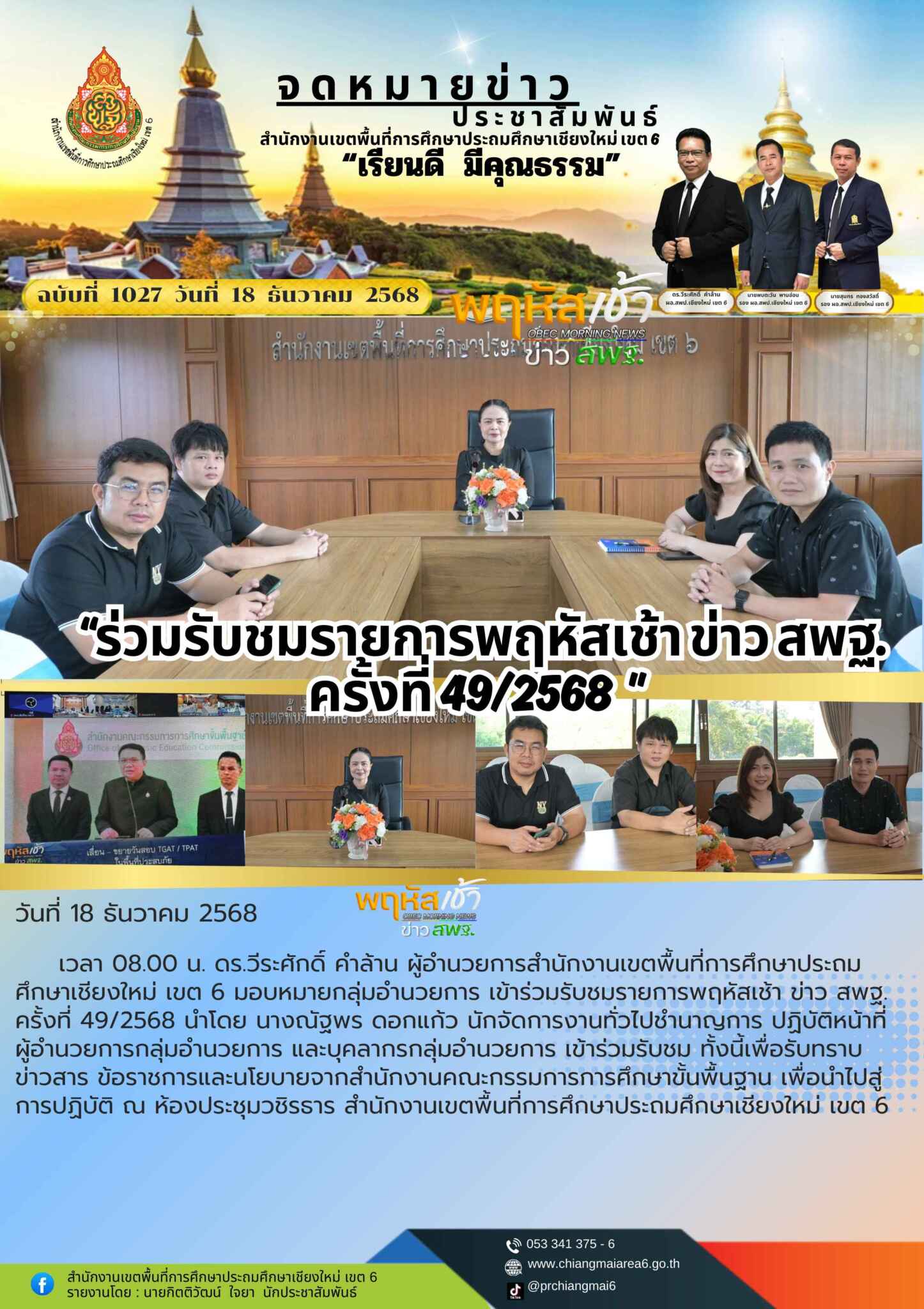 วันที่ 18 ธันวาคม 2568 เวลา 08.00 น. ดร.วีระศักดิ์ คำล้าน ผู้อำนวยการสำนักงานเขตพื้นที่การศึกษาประถมศึกษาเชียงใหม่ เขต 6 มอบหมายกลุ่มอำนวยการ เข้าร่วมรับชมรายการพฤหัสเช้า ข่าว สพฐ. ครั้งที่ 49/2568 นำโดย นางณัฐพร ดอกแก้ว นักจัดการงานทั่วไปชำนาญการ ปฏิบัติหน้าที่ผู้อำนวยการกลุ่มอำนวยการ และบุคลากรกลุ่มอำนวยการ เข้าร่วมรับชม ทั้งนี้เพื่อรับทราบข่าวสาร ข้อราชการและนโยบายจากสำนักงานคณะกรรมการการศึกษาขั้นพื้นฐาน เพื่อนำไปสู่การปฏิบัติ ณ ห้องประชุมวชิรธาร สำนักงานเขตพื้นที่การศึกษาประถมศึกษาเชียงใหม่ เขต 6