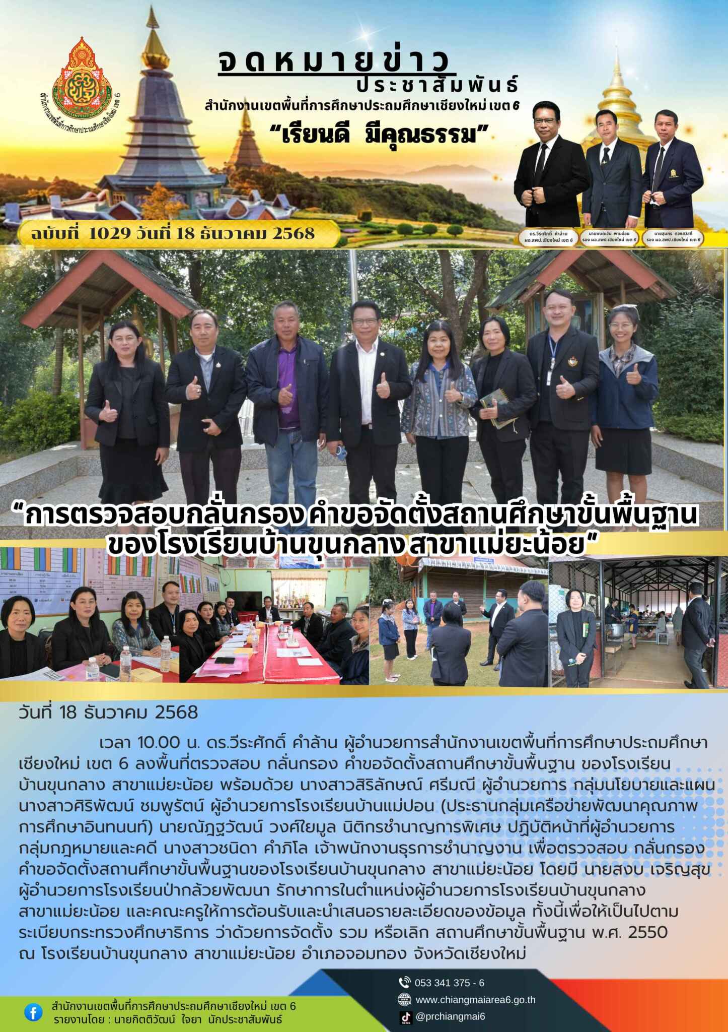 วันที่ 18 ธันวาคม 2568 เวลา 10.00 น. ดร.วีระศักดิ์ คำล้าน ผู้อำนวยการสำนักงานเขตพื้นที่การศึกษาประถมศึกษาเชียงใหม่ เขต 6 ลงพื้นที่ตรวจสอบ กลั่นกรอง คำขอจัดตั้งสถานศึกษาขั้นพื้นฐาน ของโรงเรียนบ้านขุนกลาง สาขาแม่ยะน้อย พร้อมด้วย นางสาวสิริลักษณ์ ศรีมณี ผู้อำนวยการ กลุ่มนโยบายและแผน นางสาวศิริพัฒน์ ชมพูรัตน์ ผู้อำนวยการโรงเรียนบ้านแม่ปอน (ประธานกลุ่มเครือข่ายพัฒนาคุณภาพการศึกษาอินทนนท์) นายณัฎฐวัฒน์ วงศ์ใยมูล นิติกรชำนาญการพิเศษ ปฏิบัติหน้าที่ผู้อำนวยการกลุ่มกฎหมายและคดี นางสาวชนิดา คำภิโล เจ้าพนักงานธุรการชำนาญงาน เพื่อตรวจสอบ กลั่นกรอง คำขอจัดตั้งสถานศึกษาขั้นพื้นฐานของโรงเรียนบ้านขุนกลาง สาขาแม่ยะน้อย โดยมี นายสงบ เจริญสุข ผู้อำนวยการโรงเรียนป่ากล้วยพัฒนา รักษาการในตำแหน่งผู้อำนวยการโรงเรียนบ้านขุนกลาง สาขาแม่ยะน้อย และคณะครูให้การต้อนรับและนำเสนอรายละเอียดของข้อมูล ทั้งนี้เพื่อให้เป็นไปตามระเบียบกระทรวงศึกษาธิการ ว่าด้วยการจัดตั้ง รวม หรือเลิก สถานศึกษาขั้นพื้นฐาน พ.ศ. 2550 ณ โรงเรียนบ้านขุนกลาง สาขาแม่ยะน้อย อำเภอจอมทอง จังหวัดเชียงใหม่