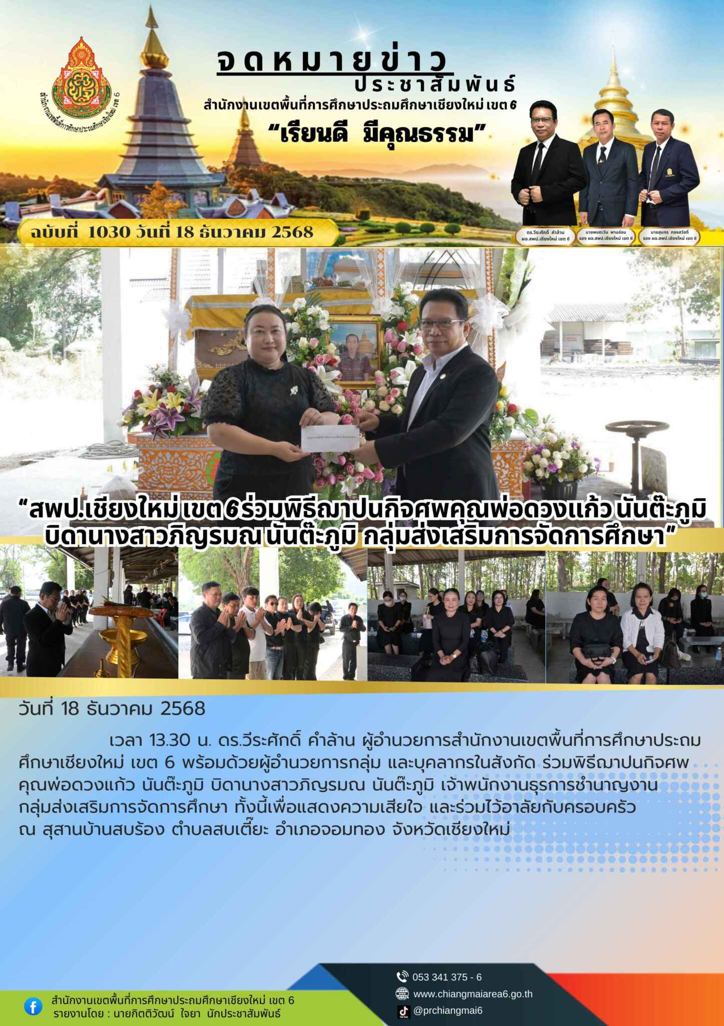 วันที่ 18 ธันวาคม 2568 เวลา 13.30 น. ดร.วีระศักดิ์ คำล้าน ผู้อำนวยการสำนักงานเขตพื้นที่การศึกษาประถมศึกษาเชียงใหม่ เขต 6 พร้อมด้วยผู้อำนวยการกลุ่ม และบุคลากรในสังกัด ร่วมพิธีฌาปนกิจศพคุณพ่อดวงแก้ว นันต๊ะภูมิ บิดานางสาวภิญรมณ นันต๊ะภูมิ เจ้าพนักงานธุรการชำนาญงาน กลุ่มส่งเสริมการจัดการศึกษา ทั้งนี้เพื่อแสดงความเสียใจ และร่วมไว้อาลัยกับครอบครัว ณ สุสานบ้านสบร้อง ตำบลสบเตี๊ยะ อำเภอจอมทอง จังหวัดเชียงใหม่