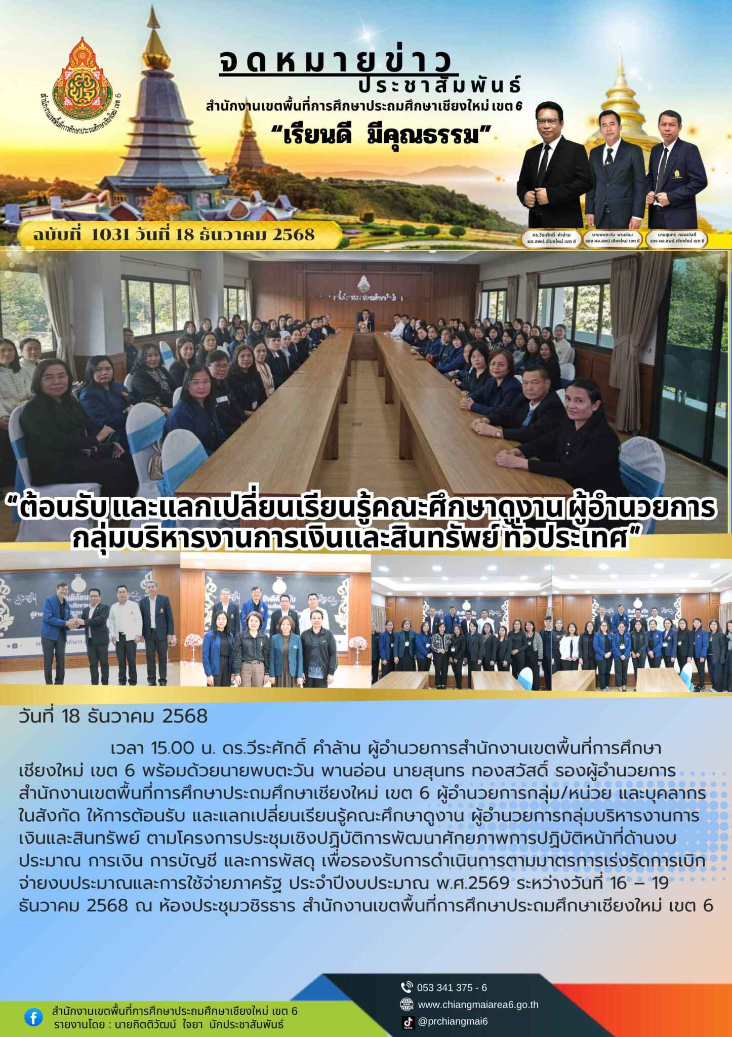 วันที่ 18 ธันวาคม 2568 เวลา 15.00 น. ดร.วีระศักดิ์ คำล้าน ผู้อำนวยการสำนักงานเขตพื้นที่การศึกษาเชียงใหม่ เขต 6 พร้อมด้วยนายพบตะวัน พานอ่อน นายสุนทร ทองสวัสดิ์ รองผู้อำนวยการสำนักงานเขตพื้นที่การศึกษาประถมศึกษาเชียงใหม่ เขต 6 ผู้อำนวยการกลุ่ม/หน่วย และบุคลากรในสังกัด ให้การต้อนรับ และแลกเปลี่ยนเรียนรู้คณะศึกษาดูงาน ผู้อำนวยการกลุ่มบริหารงานการเงินและสินทรัพย์ ตามโครงการประชุมเชิงปฏิบัติการพัฒนาศักยภาพการปฏิบัติหน้าที่ด้านงบประมาณ การเงิน การบัญชี และการพัสดุ เพื่อรองรับการดำเนินการตามมาตรการเร่งรัดการเบิกจ่ายงบประมาณและการใช้จ่ายภาครัฐ ประจำปีงบประมาณ พ.ศ.2569 ระหว่างวันที่ 16 – 19 ธันวาคม 2568 ณ ห้องประชุมวชิรธาร สำนักงานเขตพื้นที่การศึกษาประถมศึกษาเชียงใหม่ เขต 6