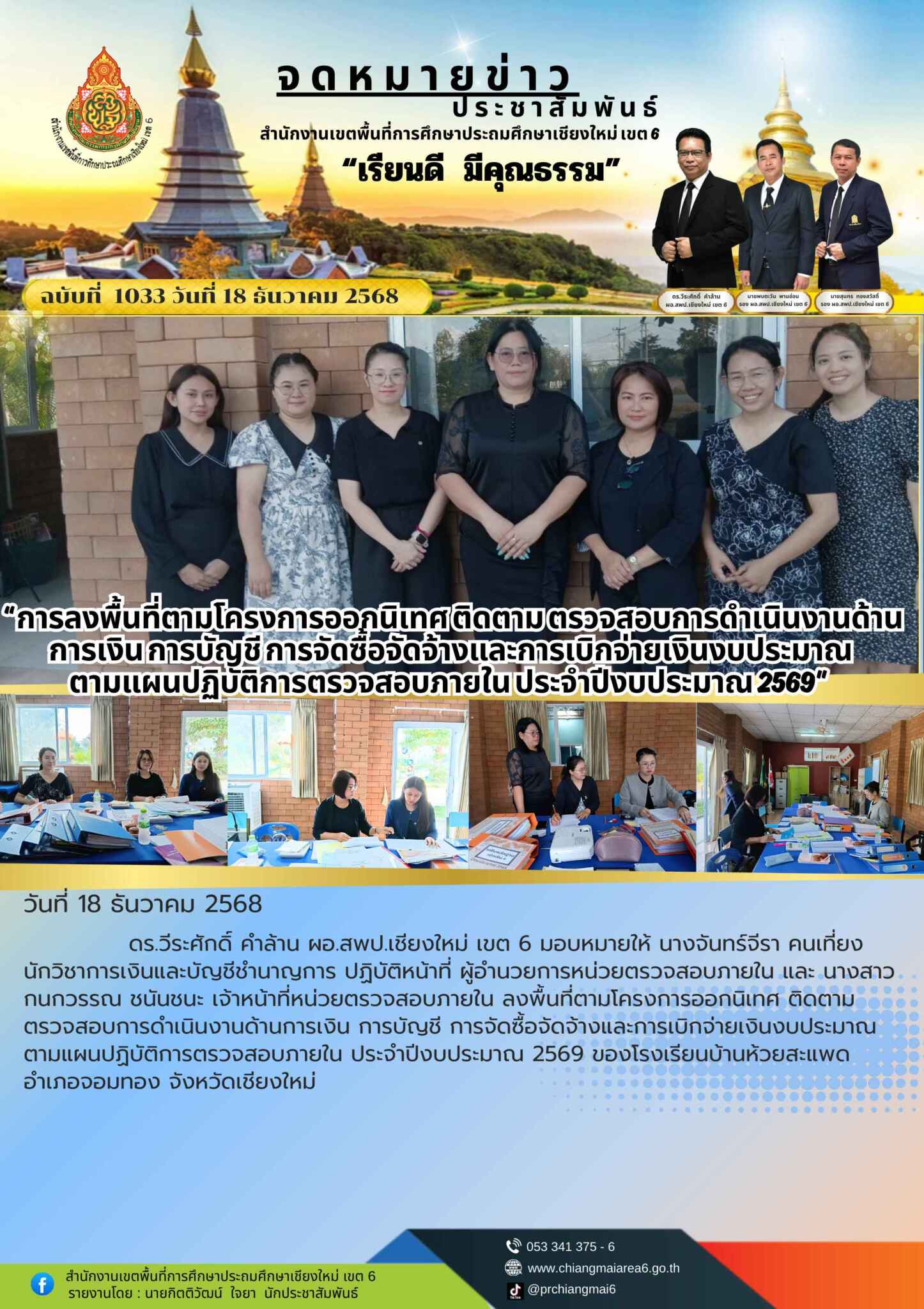 วันที่ 18 ธันวาคม 2568 ดร.วีระศักดิ์ คำล้าน ผอ.สพป.เชียงใหม่ เขต 6 มอบหมายให้ นางจันทร์จีรา คนเที่ยง นักวิชาการเงินและบัญชีชำนาญการ ปฏิบัติหน้าที่ ผู้อำนวยการหน่วยตรวจสอบภายใน และ นางสาวกนกวรรณ ชนันชนะ เจ้าหน้าที่หน่วยตรวจสอบภายใน ลงพื้นที่ตามโครงการออกนิเทศ ติดตาม ตรวจสอบการดำเนินงานด้านการเงิน การบัญชี การจัดซื้อจัดจ้างและการเบิกจ่ายเงินงบประมาณ ตามแผนปฏิบัติการตรวจสอบภายใน ประจำปีงบประมาณ 2569 ของโรงเรียนบ้านห้วยสะแพด อำเภอจอมทอง จังหวัดเชียงใหม่